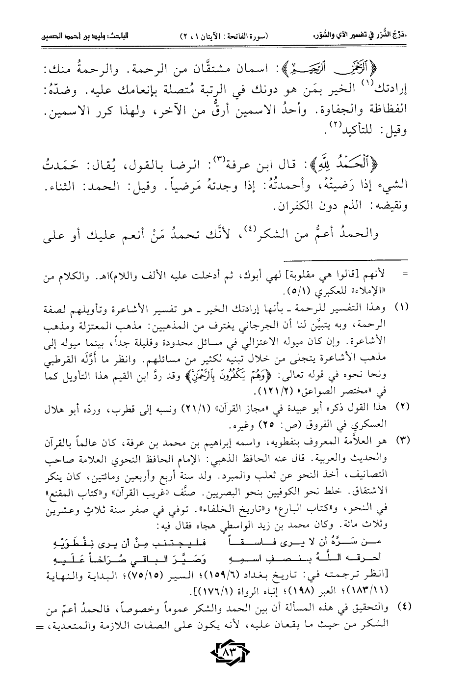 (¬4) والتحقيق في هذه المسألة أن بين الحمد والشكر عمومًا وخصوصًا، فالحمدُ أعمّ من الشكر من حيث ما يقعان عليه، لأنه يكون على الصفات اللازمة والمتعدية، =