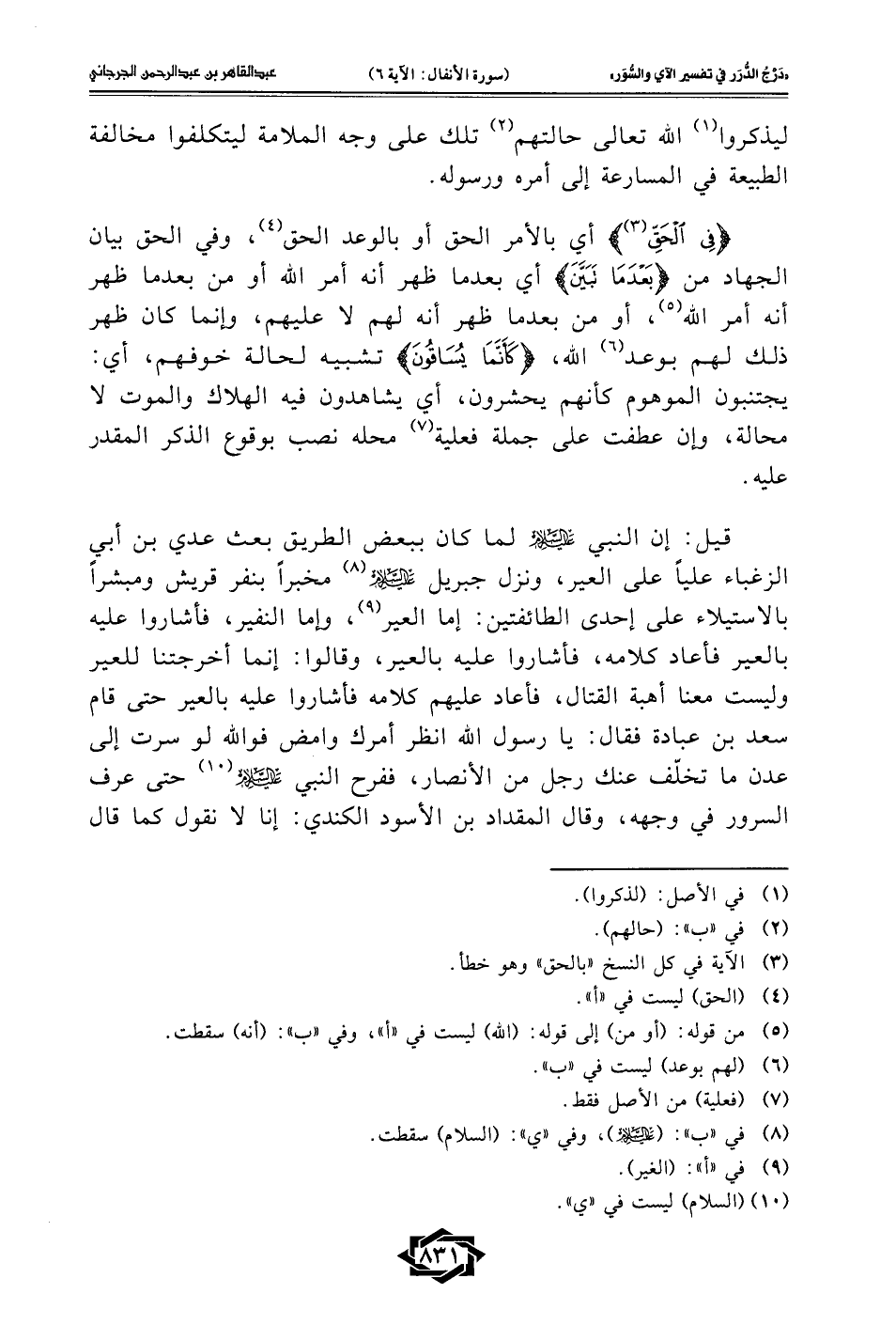{فِي الْحَقِّ} (¬3) أي بالأمر الحق أو بالوعد الحق (¬4)، وفي الحق بيان الجهاد من {بَعْدَمَا تَبَيَّنَ} أي بعد ما ظهر أنه أمر الله أو من بعد ما ظهر أنه أمر الله (¬5)، أو من بعد ما ظهر أنه لهم لا عليهم، وإنما كان ظهر ذلك لهم بوعد (¬6) الله، {كَأَنَّمَا يُسَاقُونَ} تشبيه لحالة خوفهم، أي: يجتنبون الموهوم كأنهم يحشرون، أي يشاهدون فيه الهلاك والموت لا محالة، وإن عطفت على جملة فعلية (¬7) محله نصب بوقوع الذكر المقدر عليه.