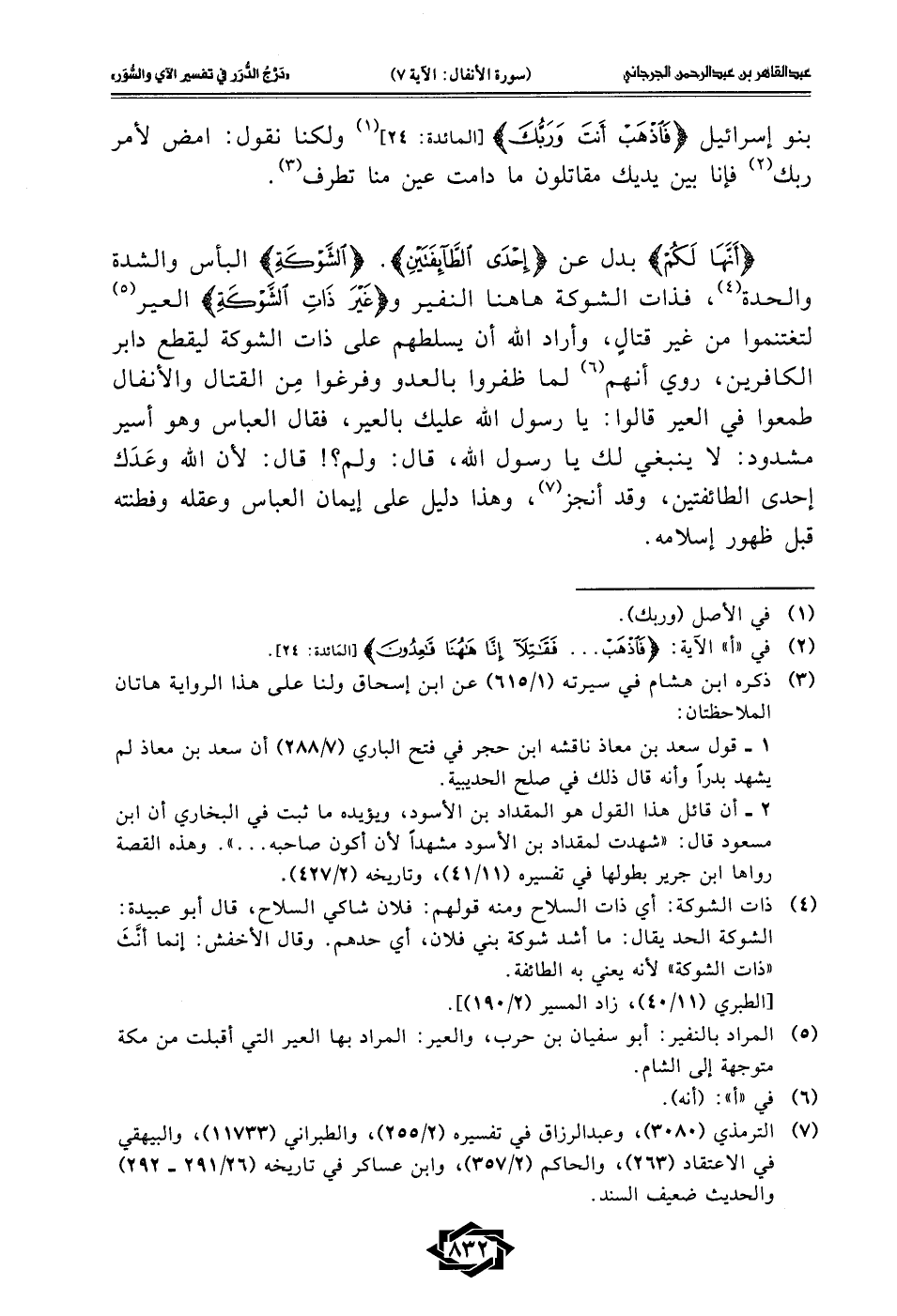 {أَنَّهَا لَكُمْ} بدل عن {إِحْدَى الطَّائِفَتَيْنِ}. {الشَّوْكَةِ} البأس والشدة والحدة (¬4)، فذات الشوكة هاهنا النفير و {غَيْرَ ذَاتِ الشَّوْكَةِ} العير (¬5) لتغتنموا من غير قتالٍ، وأراد الله أن يسلطهم على ذات الشوكة ليقطع دابر الكافرين، روي أنهم (¬6) لما ظفروا بالعدو وفرغوا مِن القتال والأنفال طمعوا في العير قالوا: يا رسول الله عليك بالعير، فقال العباس وهو أسير مشدود: لا ينبغي لك يا رسول الله، قال: ولم؟! قال: لأن الله وعَدَك إحدى الطائفتين، وقد أنجز (¬7)، وهذا دليل على إيمان العباس وعقله وفطنته قبل ظهور إسلامه.