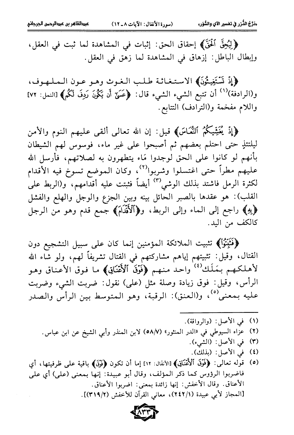 {إِذْ تَسْتَغِيثُونَ} الاستغاثة طلب الغوث وهو عون الملهوف، و (الرادفة) (¬1) أن تتبع الشيء الشيء قال: {عَسَى أَنْ يَكُونَ رَدِفَ لَكُمْ} [النمل: 72] واللام مفخمة و (الترادف) التتابع.