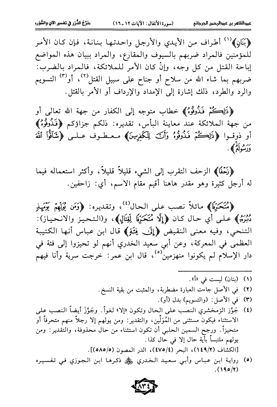 (¬4) جَوَّز الزمخشري النصب على الحال وتكون "إلا" لغوًا. وجَوَّزَ أيضًا النصب على الاستثناء فيكون مستثنى من المُوَلَّين، والتقدير: ومن يولهم إلا رجلًا منهم متحرفًا أو متحيزًا. ورجح السمين الحلبي أن تكون استثناء من حال محذوفة، والتقدير: ومن يولهم ملتبسًا بأية حال إلا في حال كذا.