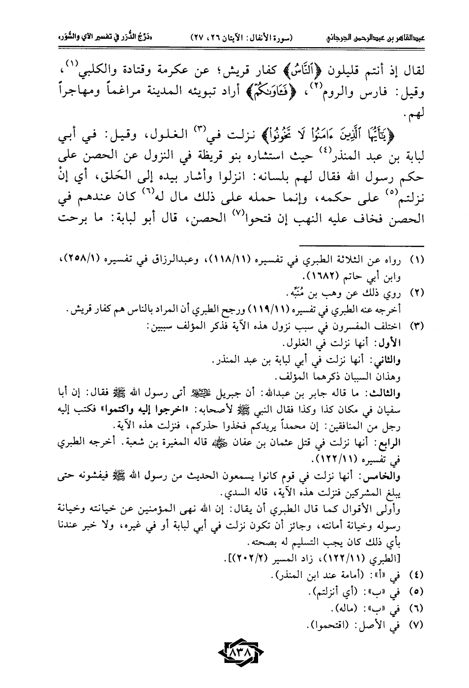 وأولى الأقوال كما قال الطبري أن يقال: إن الله نهى المؤمنين عن خيانته وخيانة رسوله وخيانة أمانته، وجائز أن تكون نزلت في أبي لبابة أو في غيره، ولا خبر عندنا بأي ذلك كان يجب التسليم له بصحته.