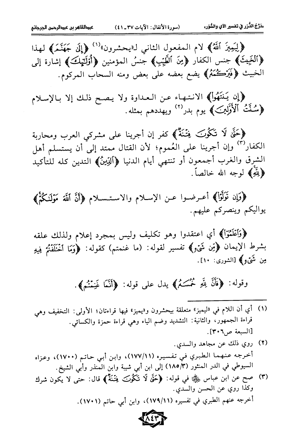 (¬1) أي أن اللام في "ليميز" متعلقة بيحشرون و"يميز" فيها قراءتان؛ الأولى: التخفيف وهي قراءة الجمهور، والثانية: التشديد وضم الياء وهي قراءة حمزة والكسائي.