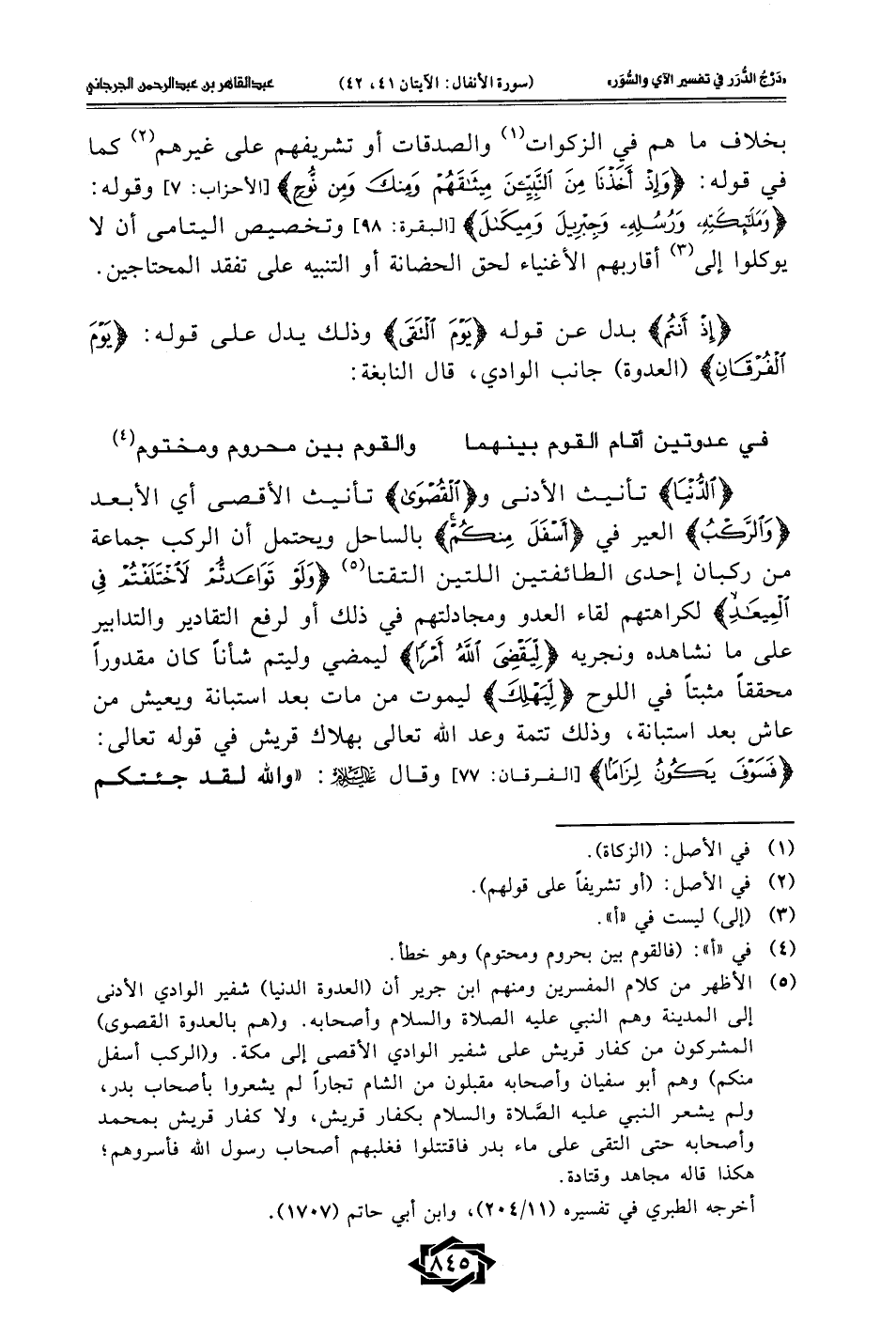(¬5) الأظهر من كلام المفسرين ومنهم ابن جرير أن (العدوة الدنيا) شفير الوادي الأدنى إلى المدينة وهم النبي عليه الصلاة والسلام وأصحابه. و (هم بالعدوة القصوى) المشركون من كفار قريش على شفير الوادي الأقصى إلى مكة. و (الركب أسفل منكم) وهم أبو سفيان وأصحابه مقبلون من الشام تجارًا لم يشعروا بأصحاب بدر، ولم يشعر النبي عليه الصَّلاة والسلام بكفار قريش، ولا كفار قريش بمحمد وأصحابه حتى التقى على ماء بدر فاقتتلوا فغلبهم أصحاب رسول الله فأسروهم؛ هكذا قاله مجاهد وقتادة.