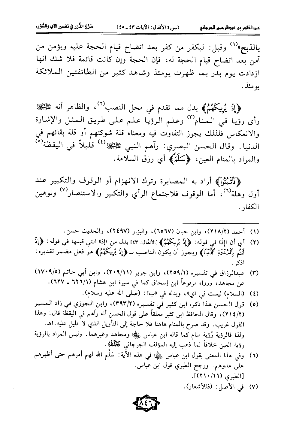 ولذا فالرؤية رُؤية منام كما قاله ابن عباس - رضي الله عنهما - ومجاهد وغيرهما. وليس المراد بالرؤية رؤية العين خلافًا لما ذهب إليه المؤلف الجرجاني -رحمه الله-.