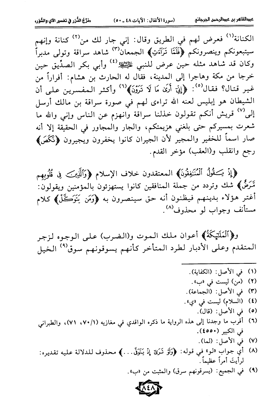 الكنانة (¬1) فعرض لهم في الطريق وقال: إني جار لك من (¬2) كنانة وإنهم سيتبعونكم وينصرونكم {فَلَمَّا تَرَاءَتِ} الجمعان (¬3) شاهد سراقة وتولى مدبرًا وكان قد شاهد مثله حين عرض للنبي -عليه السلام- (¬4) وأبي بكر الصدِّيق حين خرجا من مكة وهاجرا إلى المدينة، فقال له الحارث بن هشام: أفرارًا من غير قتال؟ فقال (¬5): {إِنِّي أَرَى مَا لَا تَرَوْنَ} (¬6) وأكثر المفسرين على أن الشيطان هو إبليس لعنه الله تراءى لهم في صورة سراقة بن مالك أرسل إلى (¬7) قريش أنكم تقولون خذلنا سراقة وانهزم عن الناس وإني والله ما شعرت بمسيركم حتى بلغني هزيمتكم، والجار والمجاور في الحقيقة إلا أنه صار اسمًا للخفير والمجير لأن الجيران كانوا يخفرون ويجيرون {نَكَصَ} رجع وانقلب و (العقب) مؤخر القدم.