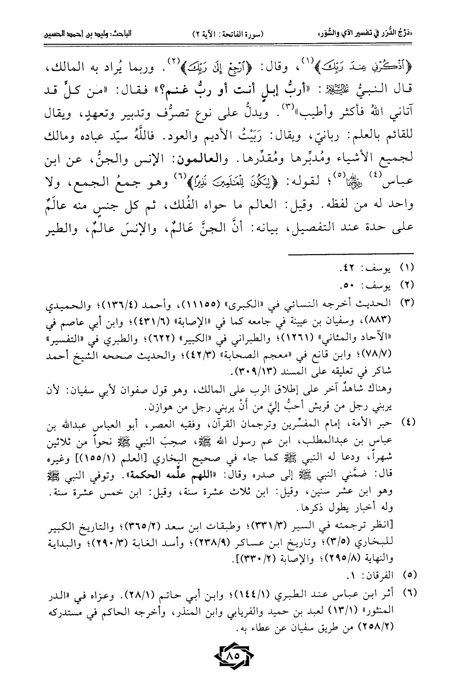 {اذْكُرْنِي عِنْدَ رَبِّكَ} (¬1)، وقال: {ارْجِعْ إِلَى رَبِّكَ} (¬2). وربما يُراد به المالك، قال النبيُّ - عليه السلام -: "أربُّ إبلٍ أنت أو ربُّ غنم؟ " فقال: "من كلِّ قد آتاني اللهُ فأكثر وأطيب" (¬3). ويدلُّ على نوع تصرُّف وتدبير وتعهدٍ، ويقال للقائم بالعلم: ربانيّ، ويقال: رَبَيْتُ الأديم والعود. فاللهُ سيّد عباده ومالك لجميع الأشياء ومُدبِّرها ومُقدَّرها. والعالمون: الإنس والجنُّ، عن ابن عباس (¬4) - رضي الله عنهما - (¬5)؛ لقوله: {لِيَكُونَ لِلْعَالَمِينَ نَذِيرًا} (¬6) وهو جمعُ الجمع، ولا واحد له من لفظه. وقيل: العالم ما حواه الفُلك، ثم كل جنسٍ منه عالَمٌ على حدة عند التفصيل، بيانه: أنَّ الجنَّ عَالمٌ، والإنسَ عالمٌ، والطير