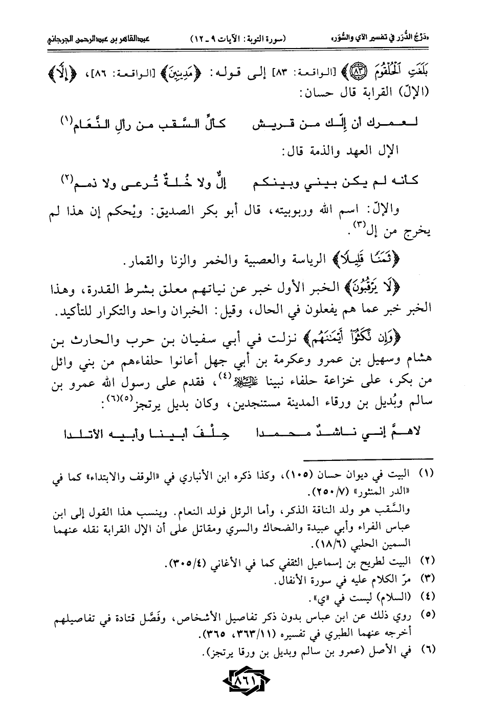 {وَإِنْ نَكَثُوا أَيْمَانَهُمْ} نزلت في أبي سفيان بن حرب والحارث بن هشام وسهيل بن عمرو وعكرمة بن أبي جهل أعانوا حلفاءهم من بني وائل من بكر، على خزاعة حلفاء نبينا -عليه السلام- (¬4)، فقدم على رسول الله عمرو بن سالم وبُديل بن ورقاء المدينة مستنجدين، وكان بديل يرتجز (¬5) (¬6):