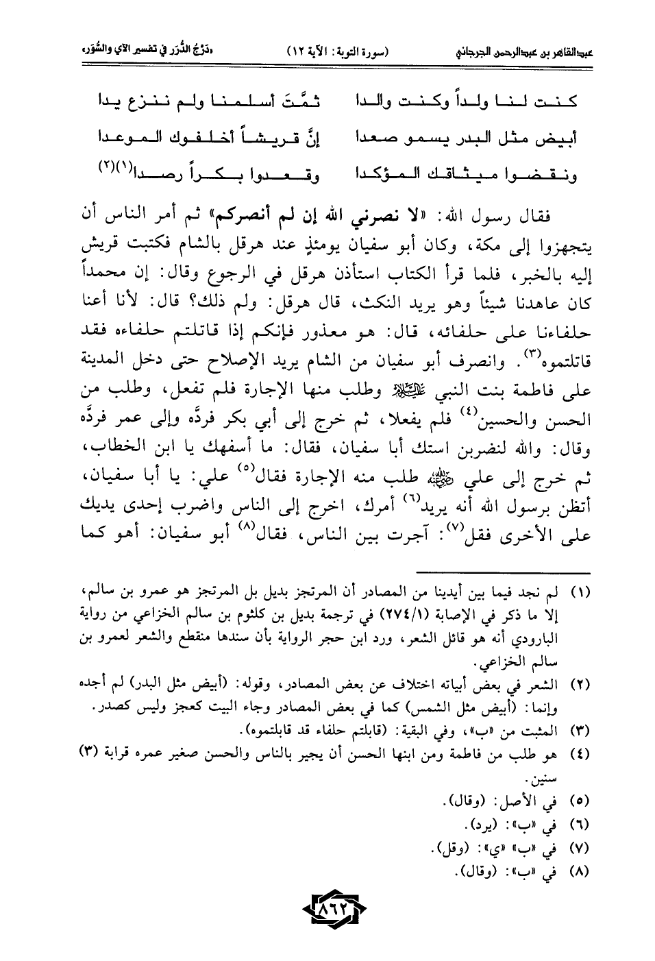 (¬1) لم نجد فيما بين أيدينا من المصادر أن المرتجز بديل بل المرتجز هو عمرو بن سالم، إلا ما ذكر في الإصابة (1/ 274) في ترجمة بديل بن كلثوم بن سالم الخزاعي من رواية البارودي أنه هو قائل الشعر، ورد ابن حجر الرواية بأن سندها منقطع والشعر لعمرو بن سالم الخزاعي.