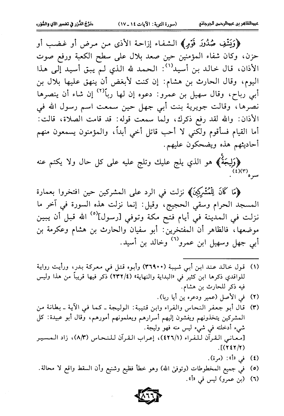 {وَيَشْفِ صُدُورَ قَوْمٍ} الشفاء إزاحة الأذى من مرض أو غضب أو حزن، وكان شفاء المؤمنين حين صعد بلال على سطح الكعبة ورفع صوت الأذان، قال خالد بن أسيد (¬1): الحمد لله الذي لم يبق أسيد إلى هذا اليوم، وقال الحارث بن هشام: إن كنت لأبغض أن ينهق عليها بلال بن أبي رباح، وقال سهيل بن عمرو: دعوه إن لها ربًا (¬2) إن شاء أن ينصرها نصرها، وقالت جويرية بنت أبي جهل حين سمعت اسم رسول الله في الأذان: والله لقد رفع ذكرك، ولما سمعت قوله: قد قامت الصلاة، قالت: أما القيام فسأقوم ولكني لا أحب قاتل أخي أبدًا، والمؤمنون يسمعون منهم أحاديثهم هذه ويضحكون عليهم.