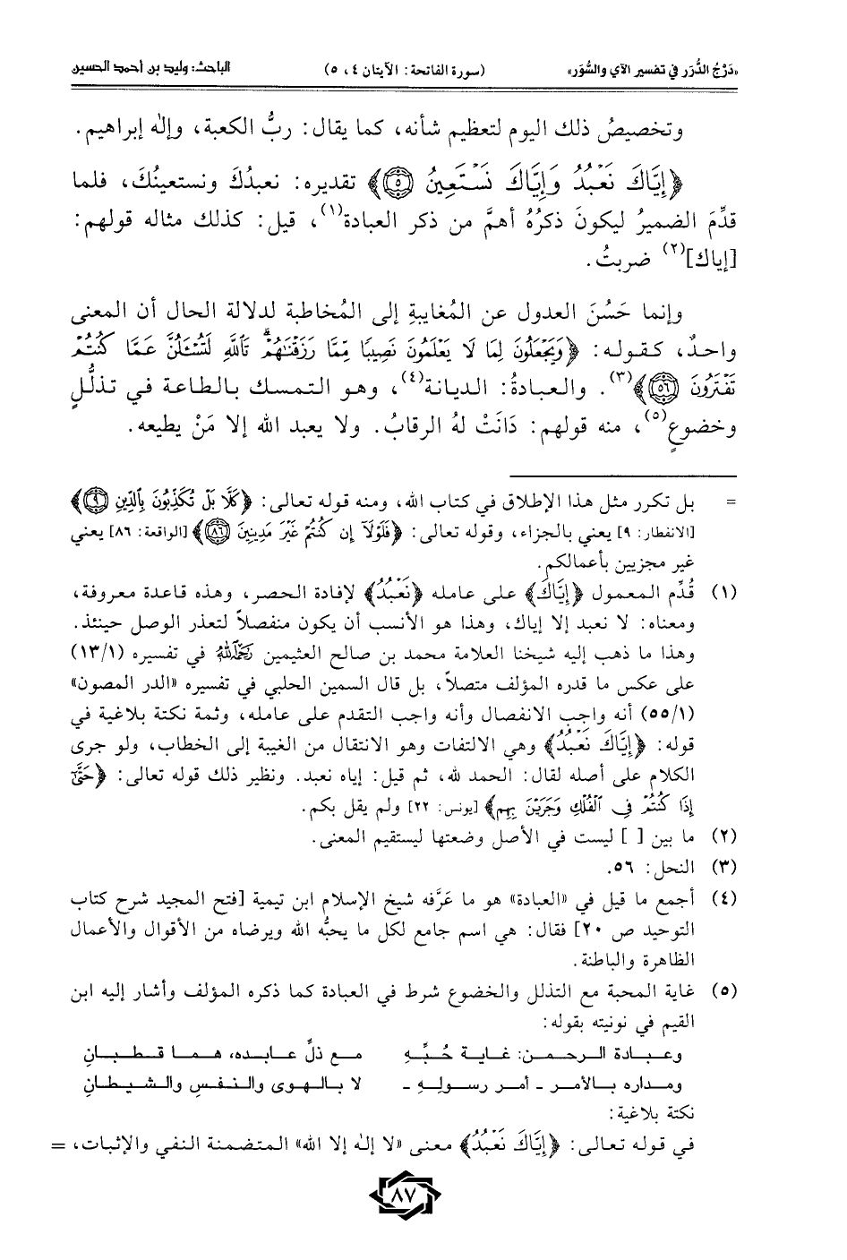 (¬1) قُدِّم المعمول {إِيَّاكَ} على عامله {نَعْبُدُ} لإفادة الحصر، وهذه قاعدة معروفة، ومعناه: لا نعبد إلا إياك، وهذا هو الأنسب أن يكون منفصلًا لتعذر الوصل حينئذ. وهذا ما ذهب إليه شيخنا العلامة محمد بن صالح العثيمين - رحمه الله - في تفسيره (1/ 13) على عكس ما قدره المؤلف متصلًا، بل قال السمين الحلبي في تفسيره "الدر المصون" (1/ 55) أنه واجِب الانفصال وأنه واجب التقدم على عامله، وثمة نكتة بلاغية في قوله: {إِيَّاكَ نَعْبُدُ} وهي الالتفات وهو الانتقال من الغيبة إلى الخطاب، ولو جرى الكلام على أصله لقال: الحمد لله، ثم قيل: إياه نعبد. ونظير ذلك قوله تعالى: {حَتَّى إِذَا كُنْتُمْ فِي الْفُلْكِ وَجَرَيْنَ بِهِمْ} ولم يقل بكم.