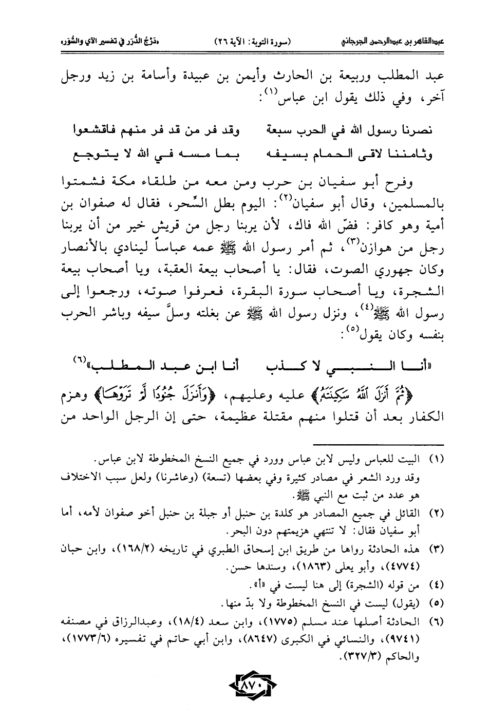 (¬2) القائل في جميع المصادر هو كلدة بن حنبل أو جبلة بن حنبل أخو صفوان لأمه، أما أبو سفيان فقال: لا تنتهي هزيمتهم دون البحر.