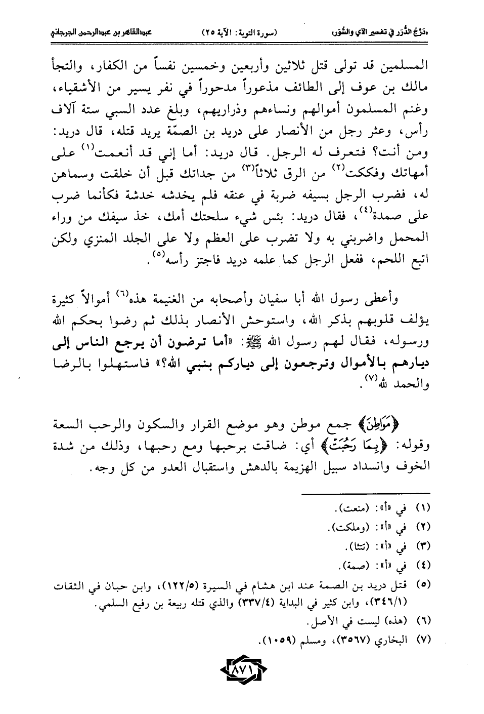 (¬5) قتل دريد بن الصمة عند ابن هشام في السيرة (5/ 122)، وابن حبان في الثقات (1/ 346)، وابن كثير في البداية (4/ 337) والذي قتله ربيعة بن رفيع السلمي.