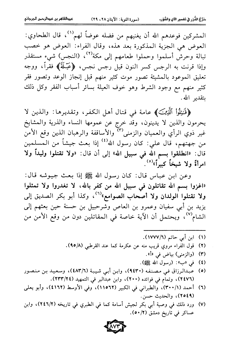 المشركين فوعدهم الله أن يغنيهم من فضله عوضًا لهم (¬1)، قال الطحاوي: العوض هي الجزية المذكورة بعد هذه، وقال الفراء: العوض هو خصب تبالة وحرش أسلموا وحملوا طعامهم إلى مكة (¬2)، (النجس) شيء مستقذر وإذا قرنت به الرجس كسر النون قيل رجس نجس، {عَيْلَةً} فقرًا، ووجه تعليق الموعود بالمشيئة تصور موت كثير منهم قبل إنجاز الوعد وتصور فقر كثير منهم مع وجود الشرط وهو خوف العيلة بسائر أسباب الفقر وكل ذلك بتقدير الله.