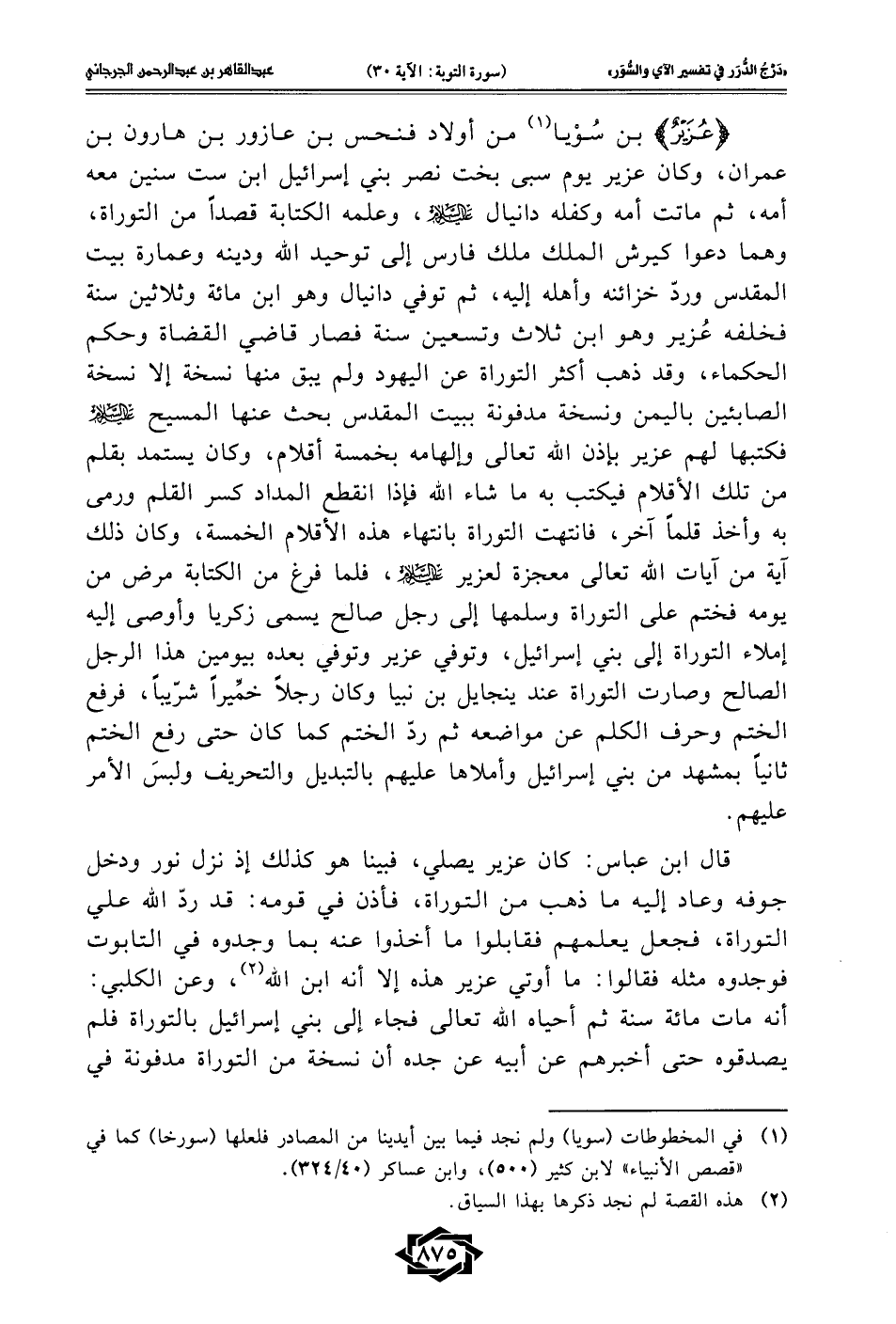 {عُزَيْرٌ} بن سُوْيا (¬1) من أولاد فنحس بن عازور بن هارون بن عمران، وكان عزير يوم سبى بخت نصر بني إسرائيل ابن ست سنين معه أمه، ثم ماتت أمه وكفله دانيال -عليه السلام-، وعلمه الكتابة قصدًا من التوراة، وهما دعوا كيرش الملك ملك فارس إلى توحيد الله ودينه وعمارة بيت المقدس وردّ خزائنه وأهله إليه، ثم توفي دانيال وهو ابن مائة وثلاثين سنة فخلفه عُزير وهو ابن ثلاث وتسعين سنة فصار قاضي القضاة وحكم الحكماء، وقد ذهب أكثر التوراة عن اليهود ولم يبق منها نسخة إلا نسخة الصابئين باليمن ونسخة مدفونة ببيت المقدس بحث عنها المسيح -عليه السلام- فكتبها لهم عزير بإذن الله تعالى وإلهامه بخمسة أقلام، وكان يستمد بقلم من تلك الأقلام فيكتب به ما شاء الله فإذا انقطع المداد كسر القلم ورمى به وأخذ قلمًا آخر، فانتهت التوراة بانتهاء هذه الأقلام الخمسة، وكان ذلك آية من آيات الله تعالى معجزة لعزير -عليه السلام-، فلما فرغ من الكتابة مرض من يومه فختم على التوراة وسلمها إلى رجل صالح يسمى زكريا وأوصى إليه إملاء التوراة إلى بني إسرائيل، وتوفي عزير وتوفي بعده بيومين هذا الرجل الصالح وصارت التوراة عند ينجايل بن نبيا وكان رجلًا خمِّيرًا شرّيبًا، فرفع الختم وحرف الكلم عن مواضعه ثم ردّ الختم كما كان حتى رفع الختم ثانيًا بمشهد من بني إسرائيل وأملاها عليهم بالتبديل والتحريف ولبسَ الأمر عليهم.