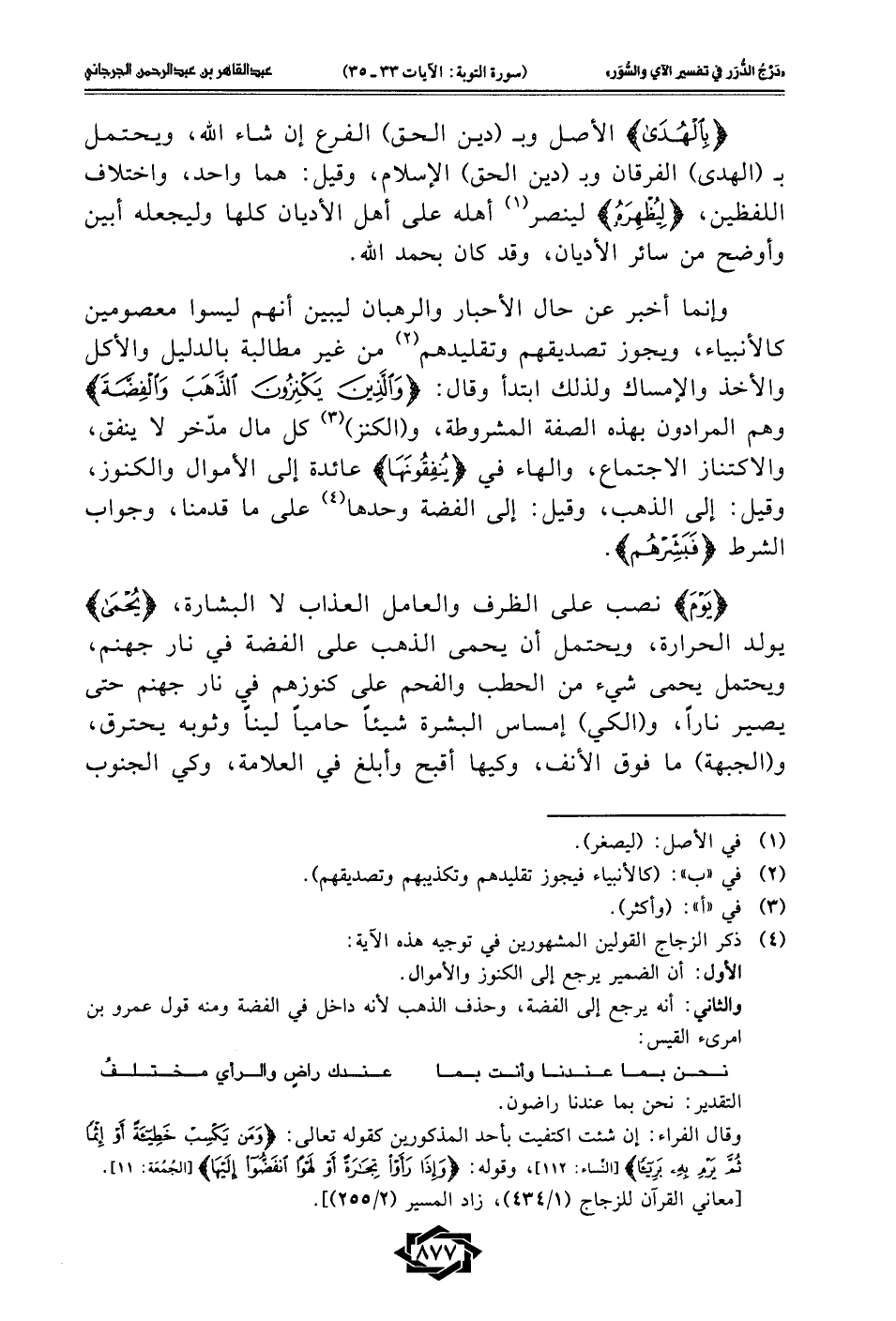 {يَومَ} نصب على الظرف والعامل العذاب لا البشارة، {يُحْمَى} يولد الحرارة، ويحتمل أن يحيى الذهب على الفضة في نار جهنم، ويحتمل يحيى شيء من الحطب والفحم على كنوزهم في نار جهنم حتى يصير نارًا، و (الكي) إمساس البشرة شيئًا حاميًا لينًا وثوبه يحترق، و (الجبهة) ما فوق الأنف، وكيها أقبح وأبلغ في العلامة، وكي الجنوب
