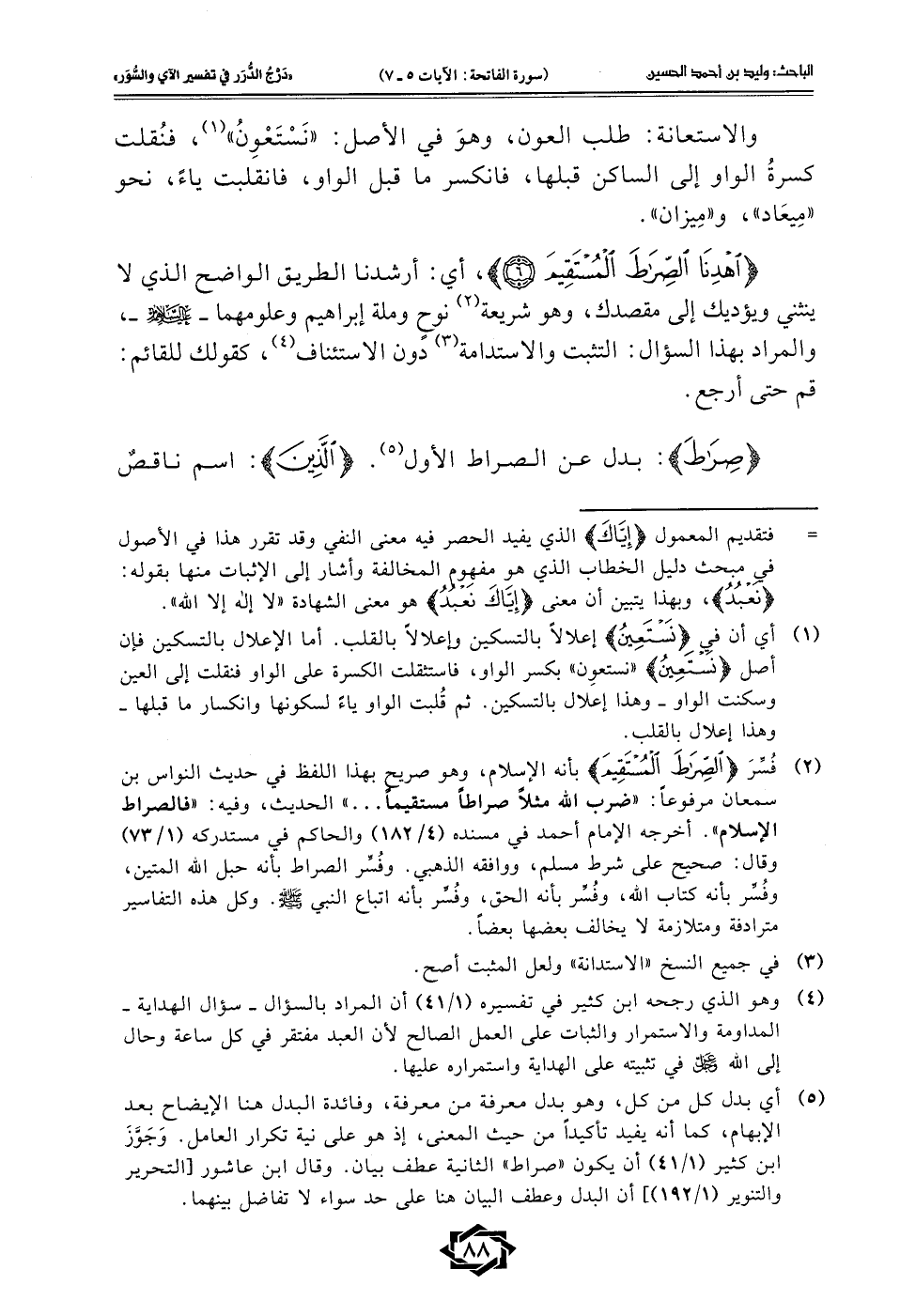 (¬1) أي أن في {نَسْتَعِينُ} إعلالًا بالتسكين واعلالًا بالقلب. أما الإعلال بالتسكين فإن أصل {نَسْتَعِينُ} "نستعوِن" بكسر الواو، فاستثقلت الكسرة على الواو فنقلت إلى العين وسكنت الواو - وهذا إعلال بالتسكين. ثم قُلبت الواو ياءً لسكونها وانكسار ما قبلها - وهذا إعلال بالقلب.