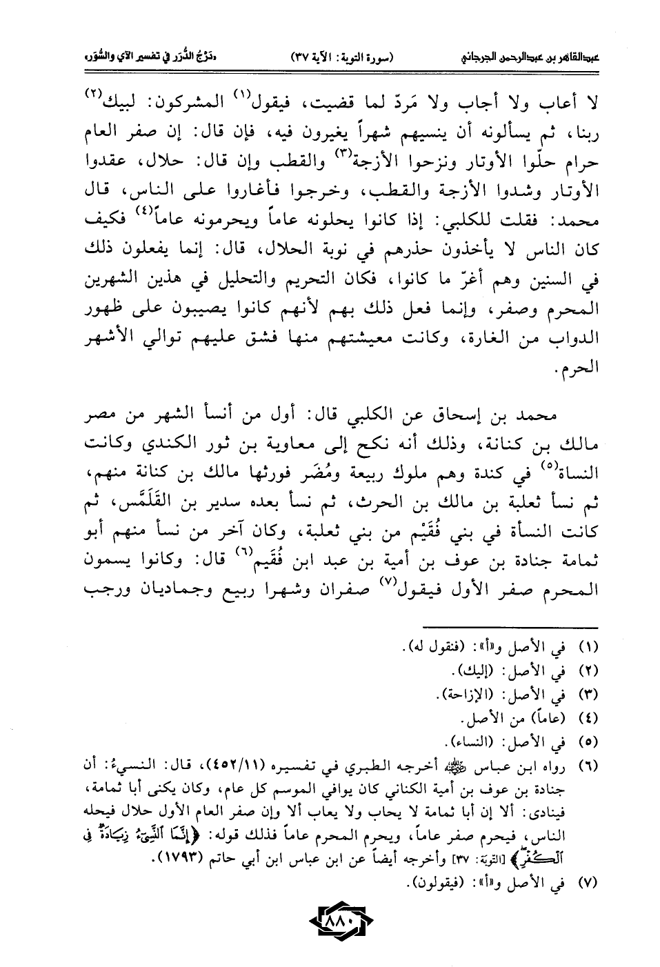 (¬6) رواه ابن عباس - رضي الله عنهما - أخرجه الطبري في تفسيره (11/ 452)، قال: النسيءُ: أن جنادة بن عوف بن أمية الكناني كان يوافي الموسم كل عام، وكان يكنى أبا ثمامة، فينادى: ألا إن أبا ثمامة لا يحاب ولا يعاب ألا وإن صفر العام الأول حلال فيحله الناس، فيحرم صفر عامًا، ويحرم المحرم عامًا فذلك قوله: {إِنَّمَا النَّسِيءُ زِيَادَةٌ فِي الْكُفْرِ} [التوبة: 37] وأخرجه أيضًا عن ابن عباس ابن أبي حاتم (1793).