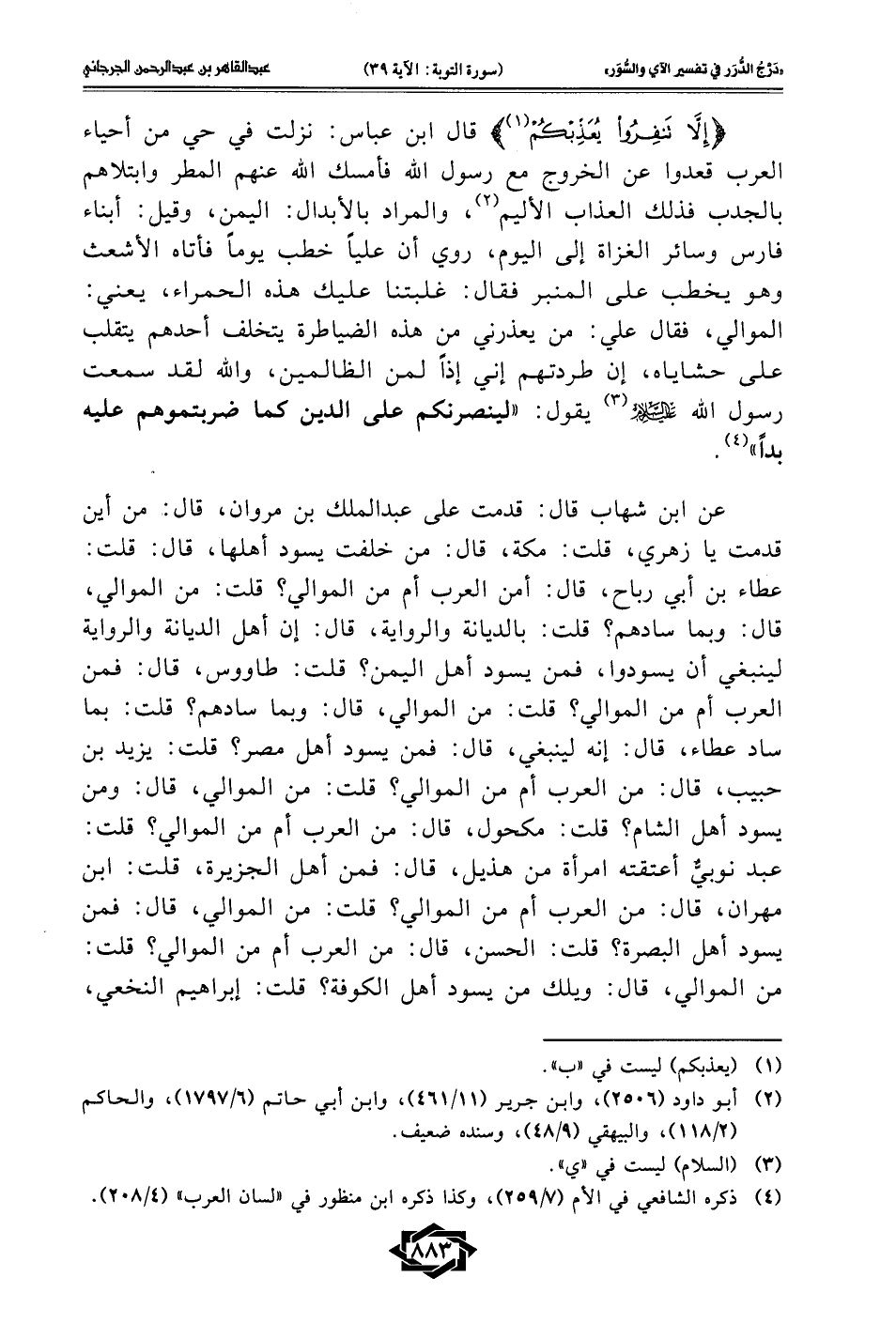 {إِلَّا تَنْفِرُوا يُعَذِّبْكُمْ (¬1)} قال ابن عباس: نزلت في حي من أحياء العرب قعدوا عن الخروج مع رسول الله فأمسك الله عنهم المطر وابتلاهم بالجدب فذلك العذاب الأليم (¬2)، والمراد بالأبدال: اليمن، وقيل: أبناء فارس وسائر الغزاة إلى اليوم، روي أن عليًا خطب يومًا فأتاه الأشعث وهو يخطب على المنبر فقال: غلبتنا عليك هذه الحمراء، يعني: الموالي، فقال علي: من يعذرني من هذه الضياطرة يتخلف أحدهم يتقلب على حشاياه، إن طردتهم إني إذًا لمن الظالمين، والله لقد سمعت رسول الله -عليه السلام- (¬3) يقول: "لينصرنكم على الدين كما ضربتموهم عليه بدًا" (¬4).
