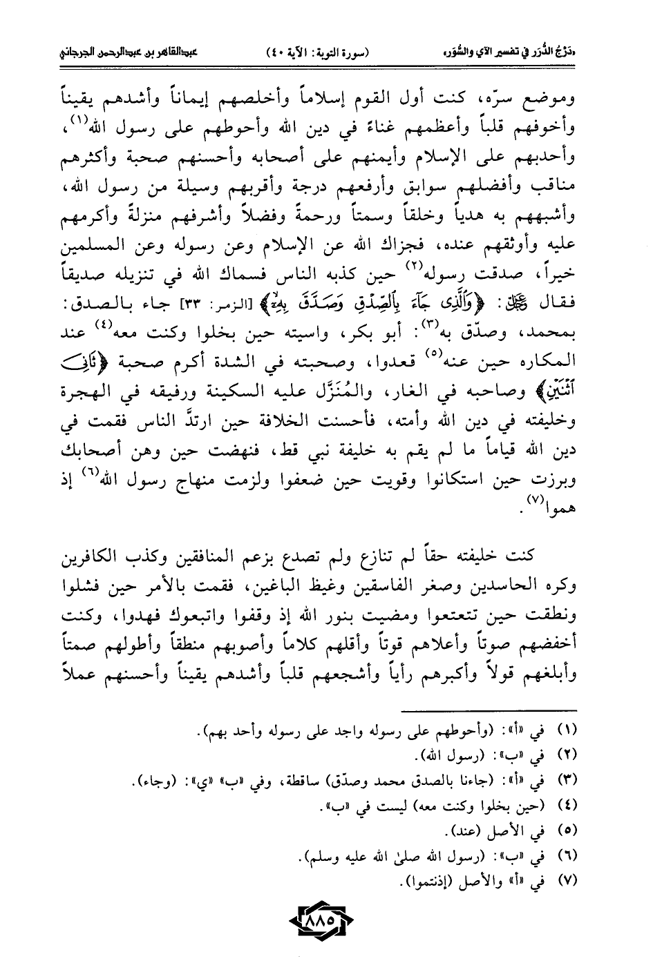 وموضع سرّه، كنت أول القوم إسلامًا وأخلصهم إيمانًا وأشدهم يقينًا وأخوفهم قلبًا وأعظمهم غناءً في دين الله وأحوطهم على رسول الله (¬1)، وأحدبهم على الإسلام وأيمنهم على أصحابه وأحسنهم صحبة وأكثرهم مناقب وأفضلهمٍ سوابق وأرفعهم درجة وأقربهم وسيلة من رسول الله، وأشبههم به هديًا وخلقًا وسمتًا ورحمةً وفضلًا وأشرفهم منزلةً وأكرمهم عليه وأوثقهم عنده، فجزاك الله عن الإسلام وعن رسوله وعن المسلمين خيرًا، صدقت رسوله (¬2) حين كذبه الناس فسماك الله في تنزيله صديقًا فقال -عَزَّ وَجَلَّ-: {وَالَّذِي جَاءَ بِالصِّدْقِ وَصَدَّقَ بِهِ} [الزمر: 33] جاء بالصدق: بمحمد، وصدّق به (¬3): أبو بكر، واسيته حين بخلوا وكنت معه (¬4) عند المكاره حين عنه (¬5) قعدوا، وصحبته في الشدة أكرم صحبة {ثَانِيَ اثْنَيْنِ} وصاحبه في الغار، والمُنَزَّل عليه السكينة ورفيقه في الهجرة وخليفته في دين الله وأمته، فأحسنت الخلافة حين ارتدَّ الناس فقمت في دين الله قيامًا ما لم يقم به خليفة نبي قط، فنهضت حين وهن أصحابك وبرزت حين استكانوا وقويت حين ضعفوا ولزمت منهاج رسول الله (¬6) إذ هموا (¬7).