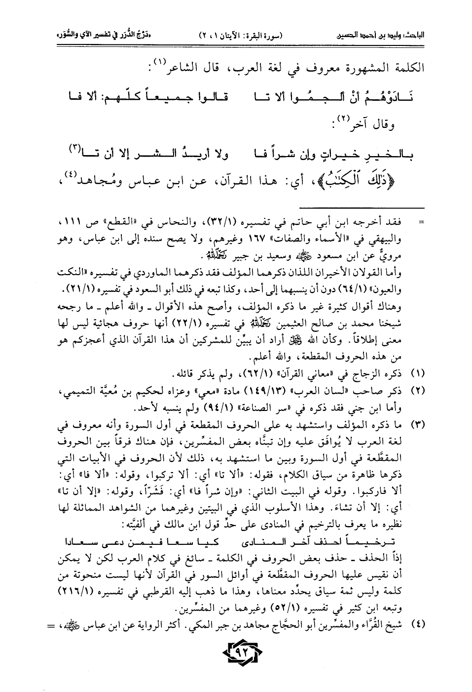 (¬3) ما ذكره المؤلف واستشهد به على الحروف المقطعة في أول السورة وأنه معروف في لغة العرب لا يُوافَق عليه وإن تبنَّاه بعض المفسَّرين، فإن هناك فرقًا بين الحروف المقطَّعة في أول السورة وبين ما استشهد به، ذلك لأن الحروف في الأبيات التي ذكرها ظاهرة من سياق الكلام، فقوله: "ألا تا" أي: ألا تركبوا، وقوله: "ألا فا" أي: ألا فاركبوا. وقوله في البيت الثاني: "وإن شرًا فا" أي: فَشَرًّا، وقوله: "إلا أن تا" أي: إلا أن تشاءَ. وهذا الأسلوب الذي في البيتين وغيرهما من الشواهد المماثلة لها نظيره ما يعرف بالترخيم في المنادى على حدِّ قول ابن مالك في ألفيَّته: