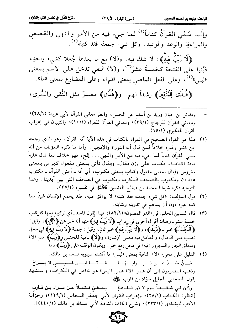 (¬1) هذا هو القول الصحيح في المراد بالكتاب في هذه الآية أنه القرآن، وهو الذي رجحه ابن كثير وغيره خلافًا لمن قال أنه التوراة والإنجيل. وأما ما ذكره المؤلف من أنه سمي القرآن كتابًا لما جيء فيه من الأمر والنهي ... إلخ، فهو خلاف لما تدل عليه مادة "كتاب"، فكتاب على وزن فِعَال، وفِعَال تأتي بمعنى مفعول كغِراس بمعنى مغروس وقِتال بمعنى مقتول وكتاب بمعنى مكتوب، أي أنه - أعني القرآن - مكتوب عند الله ومكتوب بالصحف المكرمة ومكتوب في الصحف التي بين أيدينا. وهذا التوجيه ذكره شيخنا محمد بن صالح العثيمين - رحمه الله - في تفسيره (1/ 25).