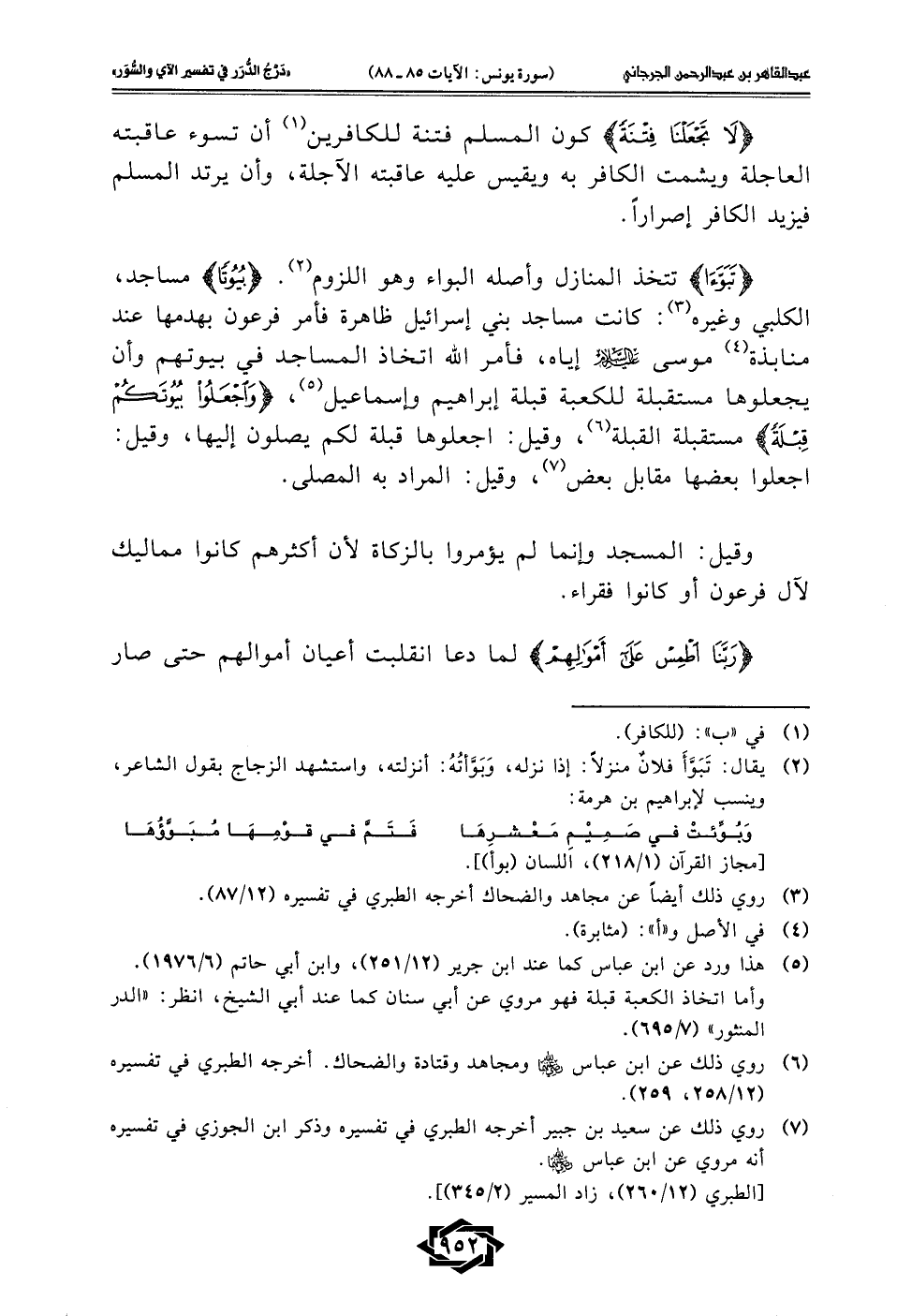 {تَبَوَّءَا} تتخذ المنازل وأصله البواء وهو اللزوم (¬2). {بُيُوتًا} مساجد، الكلبي وغيره (¬3): كانت مساجد بني إسرائيل ظاهرة فأمر فرعون بهدمها عند منابذة (¬4) موسى -عليه السلام- إياه، فأمر الله اتخاذ المساجد في بيوتهم وأن يجعلوها مستقبلة للكعبة قبلة إبراهيم وإسماعيل (¬5)، {وَاجْعَلُوا بُيُوتَكُمْ قِبْلَةً} مستقبلة القبلة (¬6)، وقيل: اجعلوها قبلة لكم يصلون إليها، وقيل: اجعلوا بعضها مقابل بعض (¬7)، وقيل: المراد به المصلى.