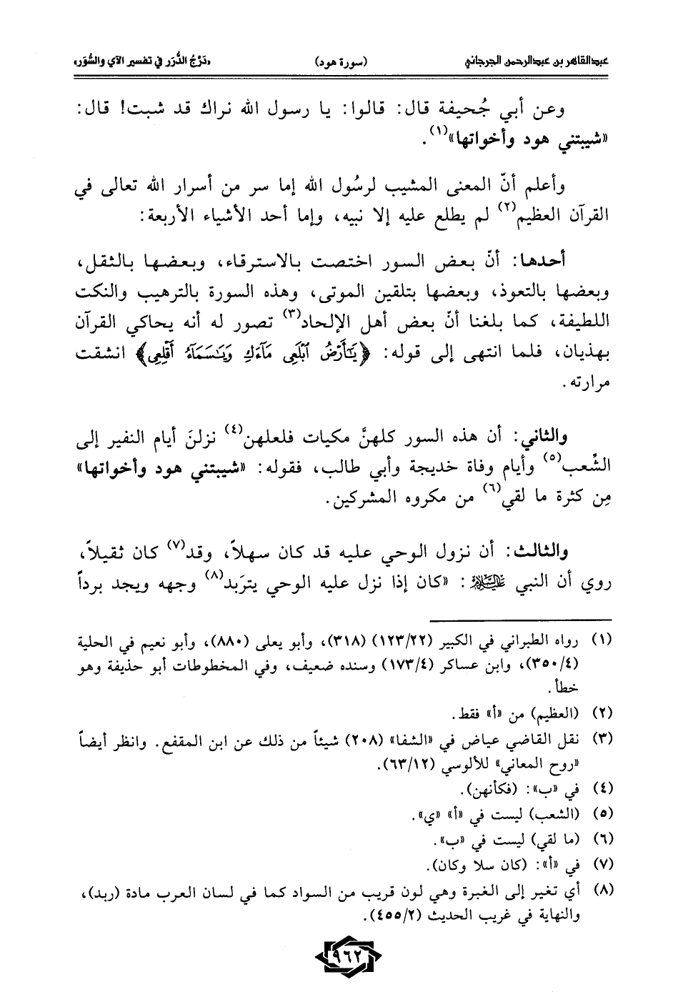 وأعلم أنّ المعنى المشيب لرسُول الله إما سر من أسرار الله تعالى في القرآن العظيم (¬2) لم يطلع عليه إلا نبيه، وإما أحد الأشياء الأربعة: