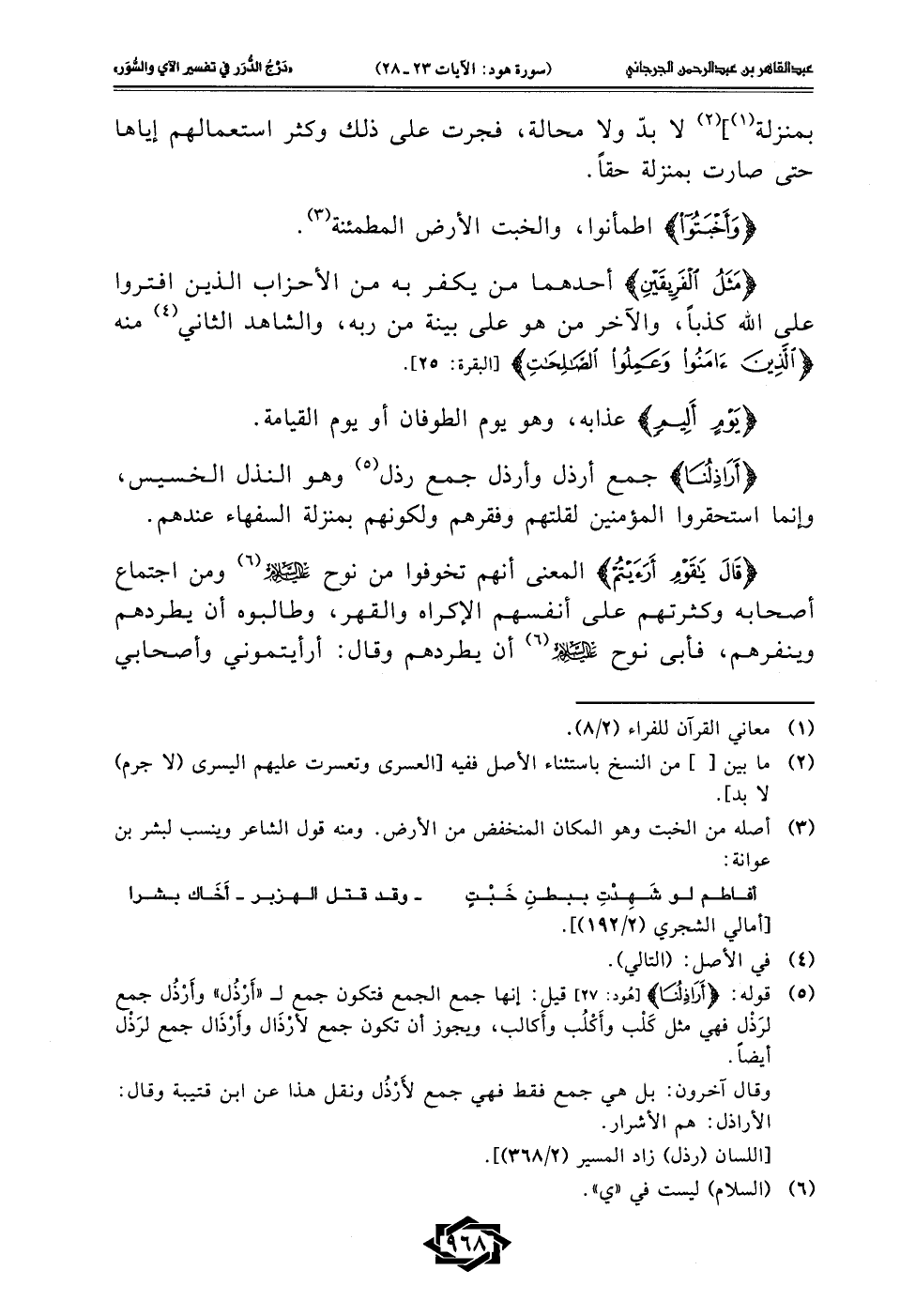 (¬5) قوله: {أَرَاذِلُنَا} [هُود: 27] قيلِ: إنها جمع الجمع فتكون جمع لـ "أَرْذُل" وأَرْذُل جمع لرَذْل فهي مثل كَلْب وأَكْلُب وأَكالب، ويجوز أن تكون جمع لأرْذَال وأَرْذَال جمع لرَذْل أيضًا.