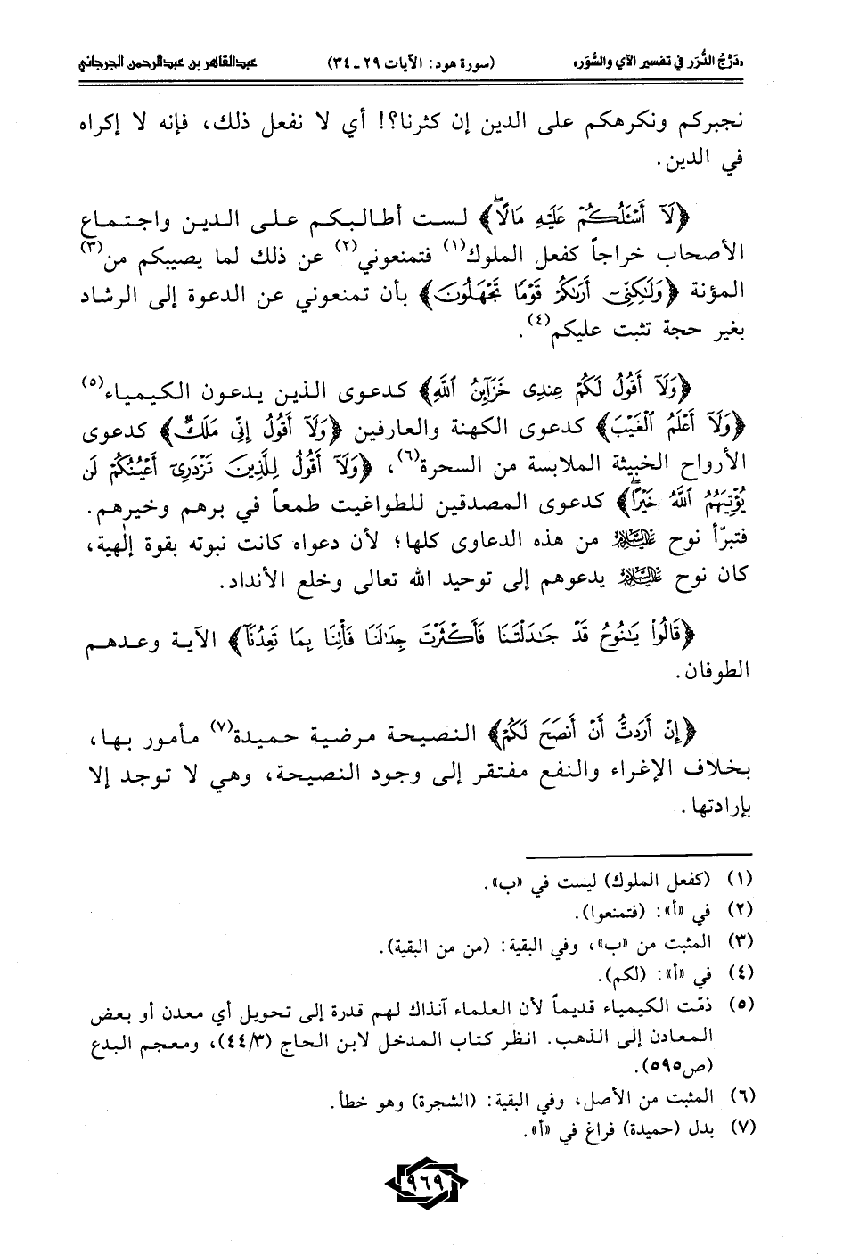 {وَلَا أَقُولُ لَكُمْ عِنْدِي خَزَائِنُ اللَّهِ} كدعوى الذين يدعون الكيمياء (¬5) {وَلَا أَعْلَمُ الْغَيْبَ} كدعوى الكهنة والعارفين {وَلَا أَقُولُ إِنِّي مَلَكٌ} كدعوى الأرواح الخبيثة الملابسة من السحرة (¬6)، {وَلَا أَقُولُ لِلَّذِينَ تَزْدَرِي أَعْيُنُكُمْ لَنْ يُؤْتِيَهُمُ اللَّهُ خَيْرًا} كدعوى المصدقين للطواغيت طمعًا في برهم وخيرهم. فتبرّأ نوح -عليه السلام- من هذه الدعاوى كلها؛ لأن دعواه كانت نبوته بقوة إلهية، كان نوح -عليه السلام- يدعوهم إلى توحيد الله تعالى وخلع الأنداد.