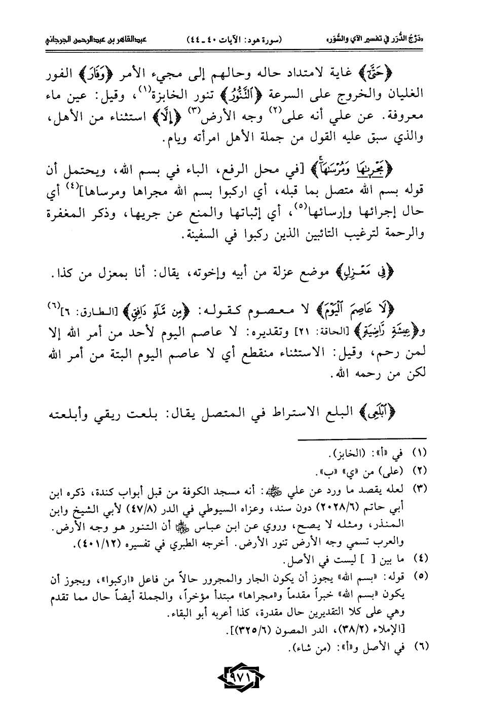 (¬5) قوله: "بسم الله" يجوز أن يكون الجار والمجرور حالًا من فاعل "اركبوا"، ويجوز أن يكون "بسم الله" خبرًا مقدمًا و"مجراها" مبتدأ مؤخرًا، والجملة أيضأ حال مما تقدم وهي على كلا التقديرين حال مقدرة، كذا أعربه أبو البقاء.