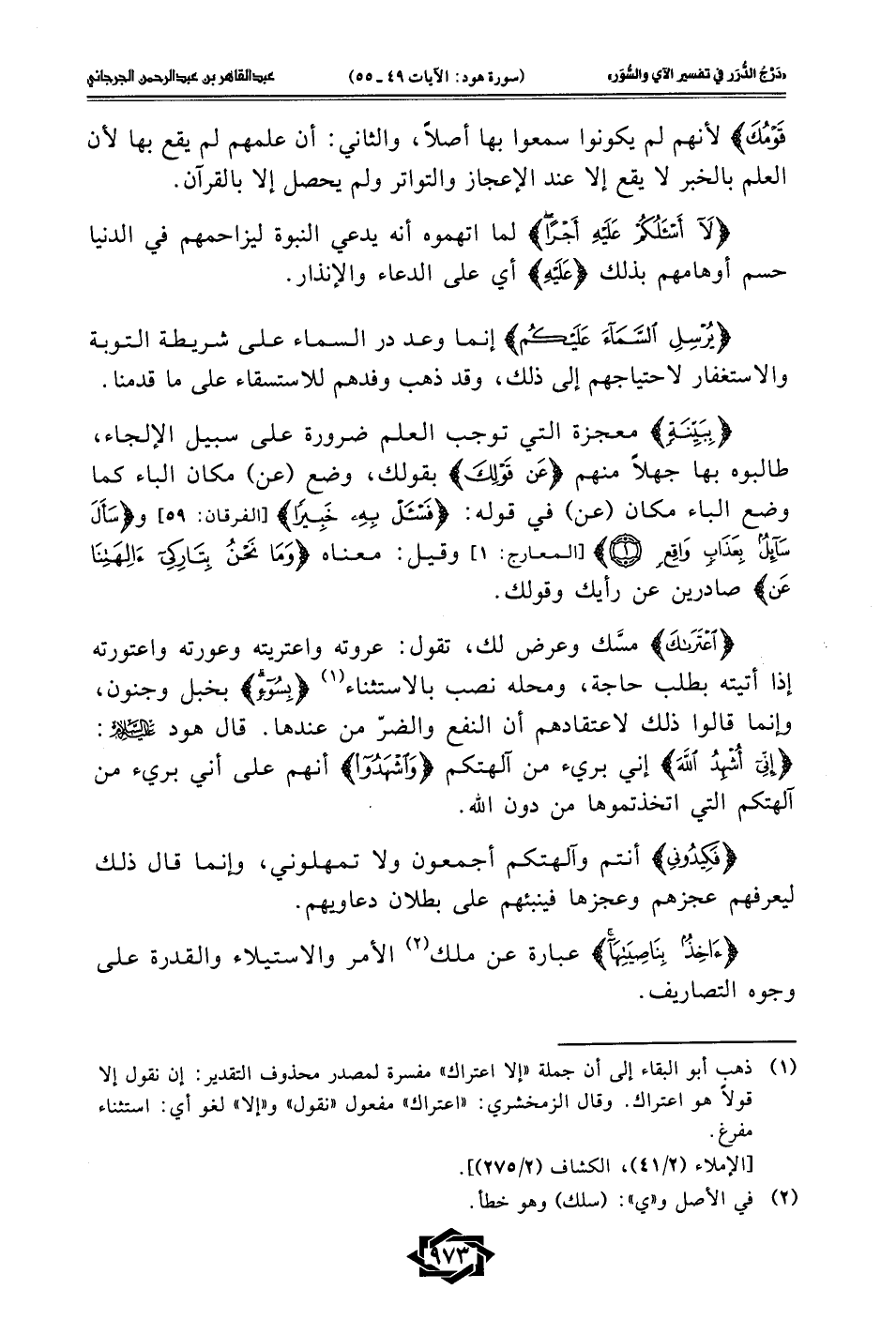 (¬1) ذهب أبو البقاء إلى أن جملة "إلا اعتراك" مفسرة لمصدر محذوف التقدير: إن نقول إلا قولًا هو اعتراك. وقال الزمخشري: "اعتراك" مفعول "نقول" و"إلا" لغو أي: استثناء مفرغ.