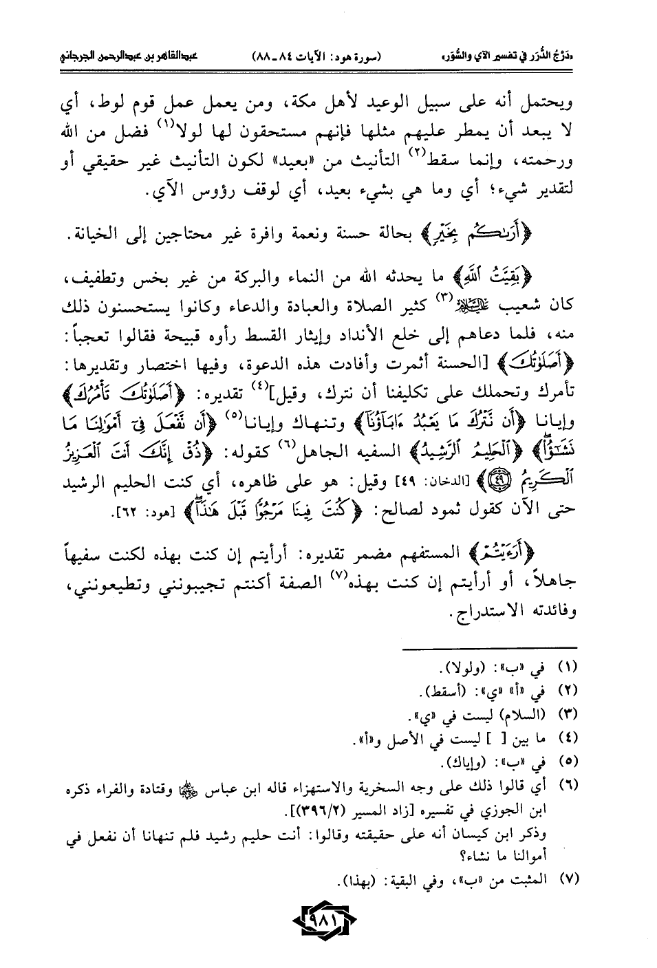 {بَقِيَّتُ اللَّهِ} ما يحدثه الله من النماء والبركة من غير بخس وتطفيف، كان شعيب -عليه السلام- (¬3) كثير الصلاة والعبادة والدعاء وكانوا يستحسنون ذلك منه، فلما دعاهم إلى خلع الأنداد وإيثار القسط رأوه قبيحة فقالوا تعجبًا: {أَصَلَاتُكَ} [الحسنة أثمرت وأفادت هذه الدعوة، وفيها اختصار وتقديرها: تأمرك وتحملك على تكليفنا أن نترك، وقيل] (¬4) تقديره: {أَصَلَاتُكَ تَأْمُرُكَ} وإيانا {أَنْ نَتْرُكَ مَا يَعْبُدُ آبَاؤُنَا} وتنهاك وإيانا (¬5) {أَنْ نَفْعَلَ فِي أَمْوَالِنَا مَا نَشَاءُ} {الْحَلِيمُ الرَّشِيدُ} السفيه الجاهل (¬6) كقوله: {ذُقْ إِنَّكَ أَنْتَ الْعَزِيزُ الْكَرِيمُ (49)} [الدخان: 49] وقيل: هو على ظاهره، أي كنت الحليم الرشيد حتى الآن كقول ثمود لصالح: {كُنْتَ فِينَا مَرْجُوًّا قَبْلَ هَذَا} [هود:62].