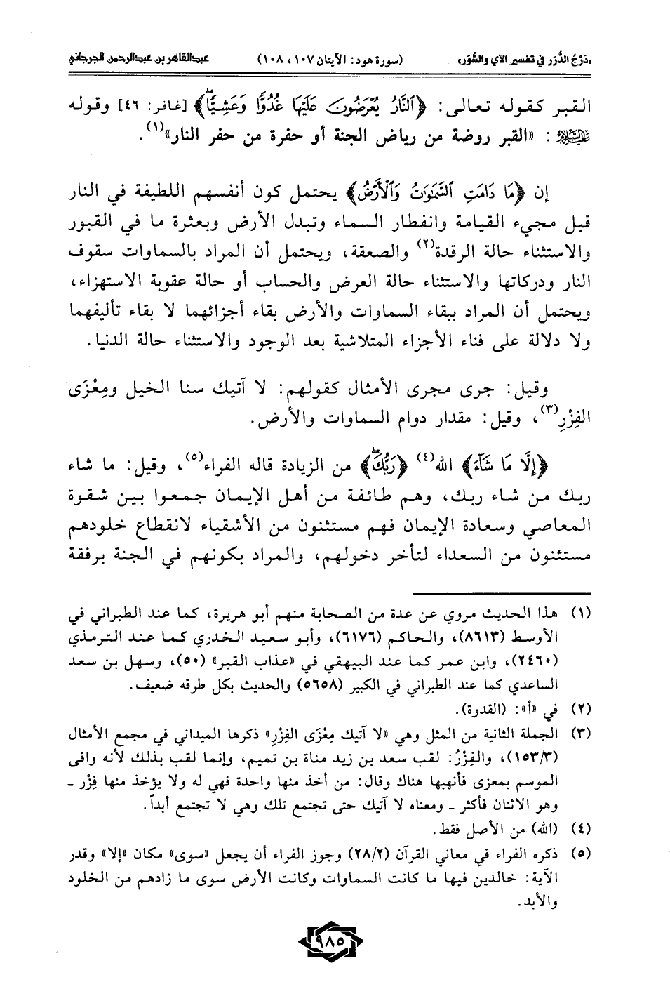 القبر كقوله تعالى: {النَّارُ يُعْرَضُونَ عَلَيْهَا غُدُوًّا وَعَشِيًّا} [غافر: 46] وقوله -عليه السلام-: (القبر روضة من ري اض الجنة أو حفرة من حفر النار" (¬1).