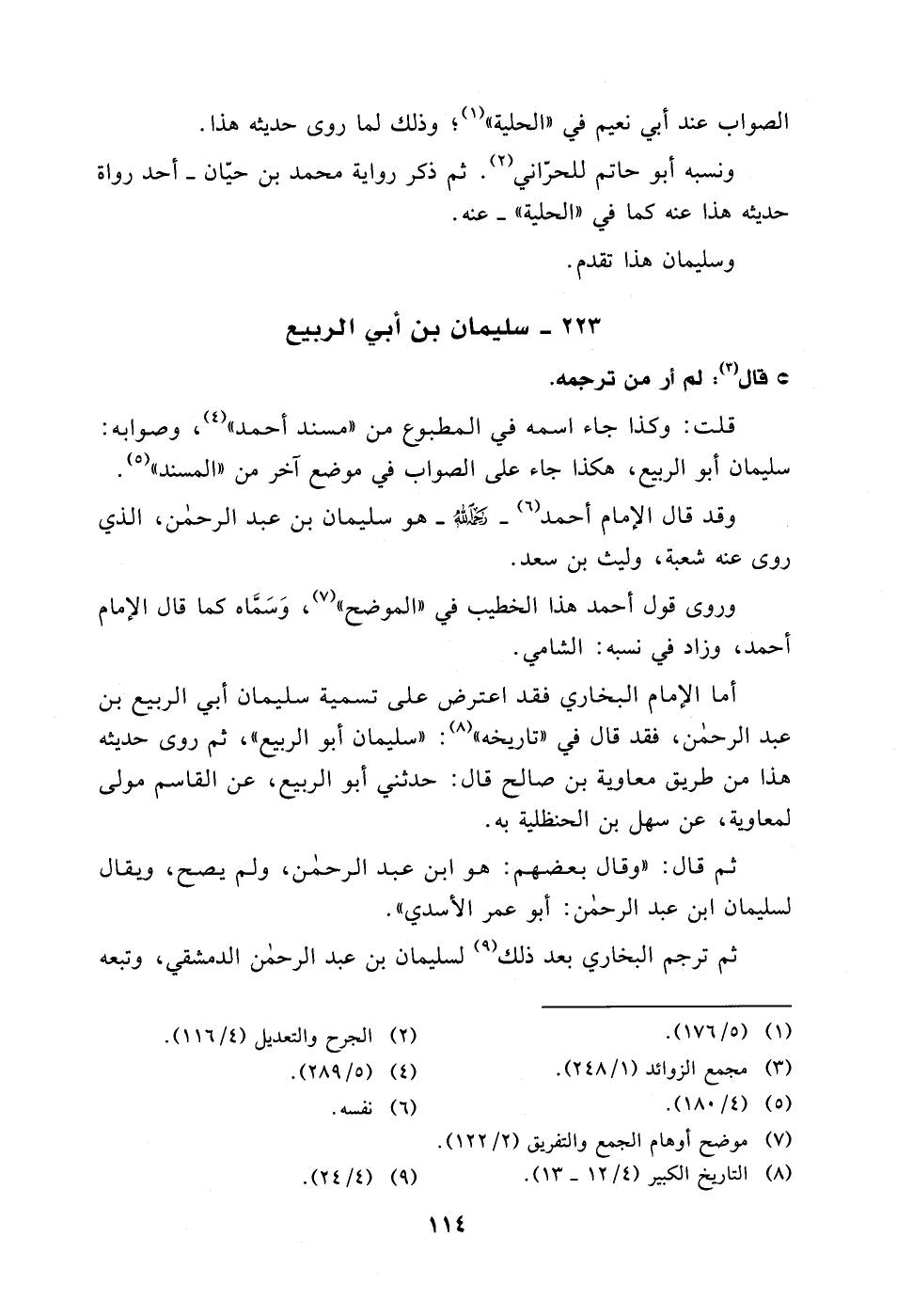 أما الإمام البخاري فقد اعترض على تسمية سليمان أبي الربيع بن عبد الرحمن، فقد قال في "تاريخه" (¬8): "سليمان أبو الربيع"، ثم روى حديثه هذا من طريق معاوية بن صالح قال: حدثني أبو الربيع، عن القاسم مولى لمعاوية، عن سهل بن الحنظلية به.