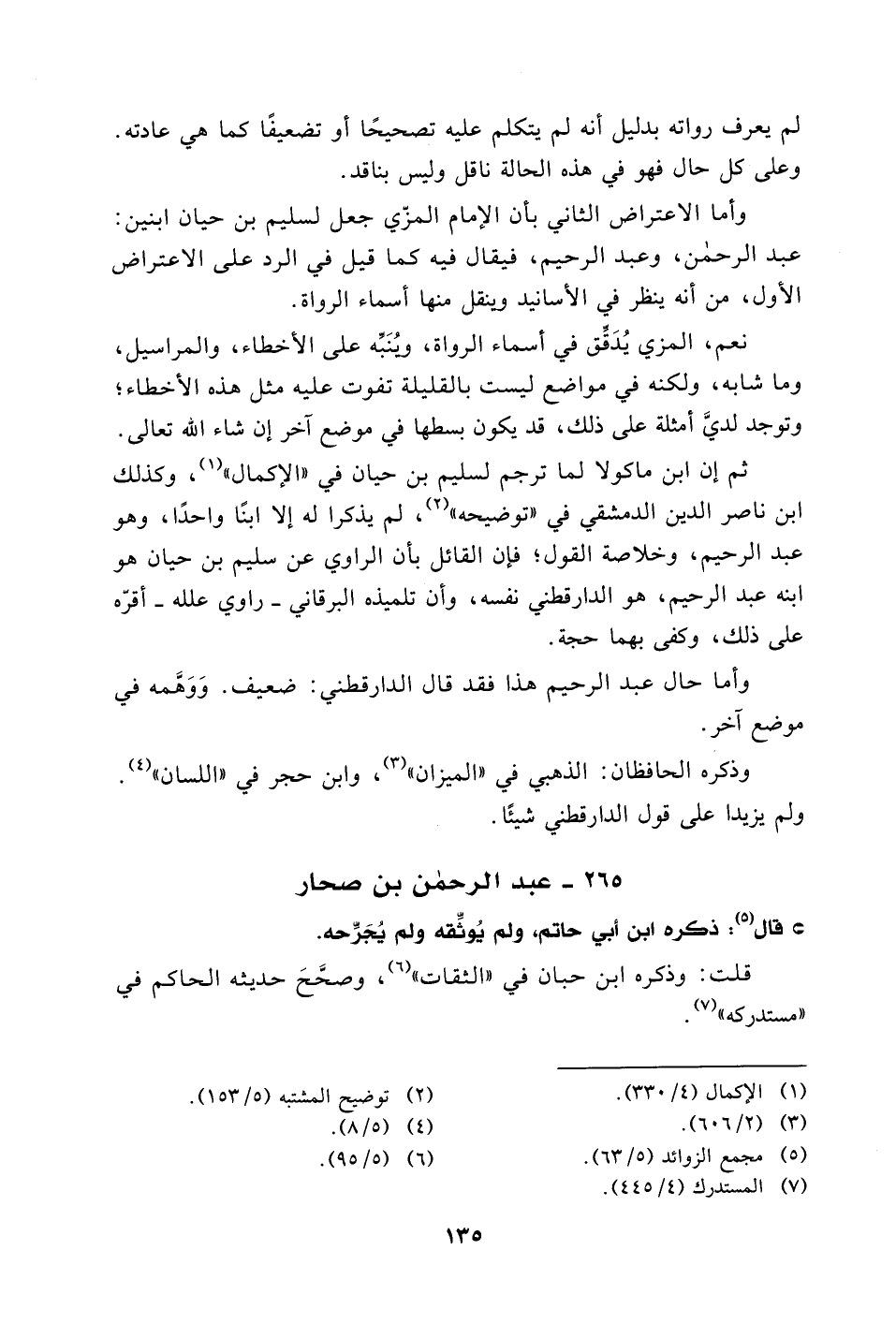 ثم إن ابن ماكولا لما ترجم لسليم بن حيان في "الإكمال" (¬1)، وكذلك ابن ناصر الدين الدمشقي في "توضيحه" (¬2)، لم يذكرا له إلا ابنًا واحداً، وهو عبد الرحيم، وخلاصة القول؛ فإن القائل بأن الراوي عن سليم بن حيان هو ابنه عبد الرحيم، هو الدارقطني نفسه، وأن تلميذه البرقاني -راوي علله- أقرّه على ذلك، وكفى بهما حجة.