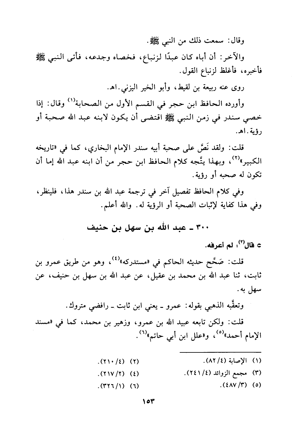 وفي كلام الحافظ تفصيل آخر في ترجمة عبد الله بن سندر هذا، فلينظر، وفي هذا كفاية لإثبات الصحبة أو الرؤية له. والله أعلم.