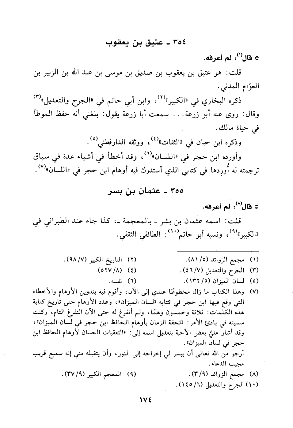 (¬7) وهذا الكتاب ما زال مخطوطًا عندي إلى الآن، وأقوم فيه بتدوين الأوهام والأخطاء التي وقع فيها ابن حجر في كتابه "السان الميزان"، وعدد الأوهام حتى تاريخ كتابة هذه الكلمات: ثلاثة وخمسون وهمًا, ولم أتفرغ له حتى الآن التفرغ التام، وكنت سميته في بادئ الأمر: "تحفة الزمان بأوهام الحافظ ابن حجر في لسان الميزان"، وقد أشار على بعض الأحبة بتعديل اسمه إلى: "التعقبات الحسان لأوهام الحافظ ابن حجر في لسان الميزان".