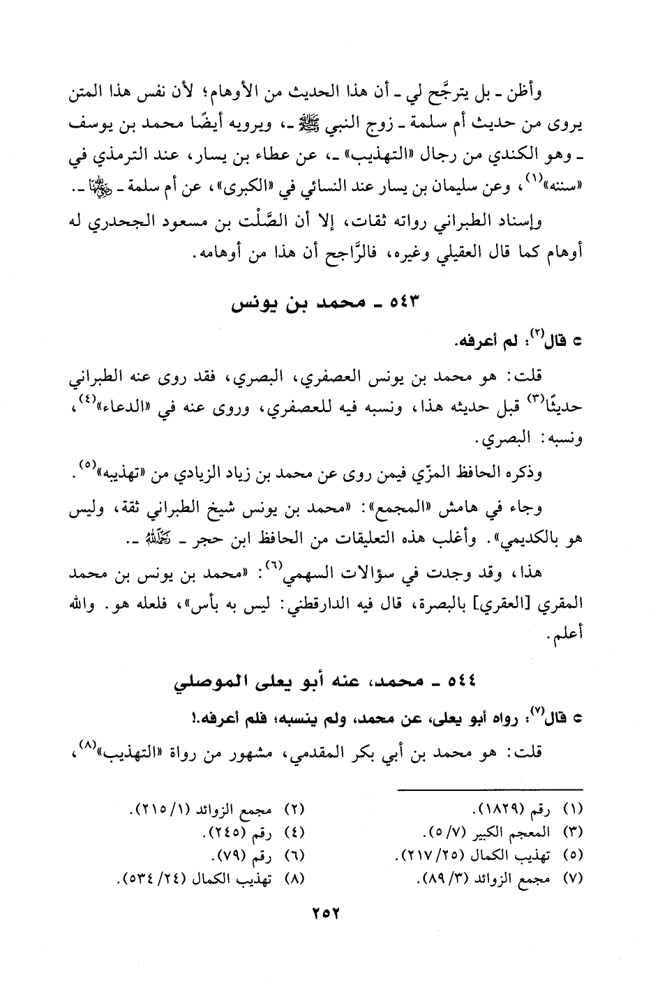 وجاء في هامش "المجمع": "محمد بن يونس شيخ الطبراني ثقة، وليس هو بالكديمي". وأغلب هذه التعليقات من الحافظ ابن حجر -رحمه الله-.