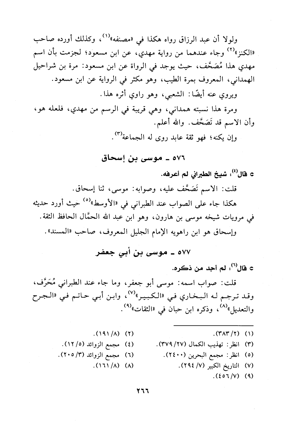 ولولا أن عبد الرزاق رواه هكذا في "مصنفه" (¬1)، وكذلك أورده صاحب "الكنز" (¬2) وجاء عندهما من رواية مهدي، عن ابن مسعود؛ لجزمت بأن اسم مهدي هذا مُصَحَّف، حيث يوجد في الرواة عن ابن مسعود: مرة بن شراحيل الهمداني، المعروف بمرة الطيب، وهو مكثر في الرواية عن ابن مسعود.