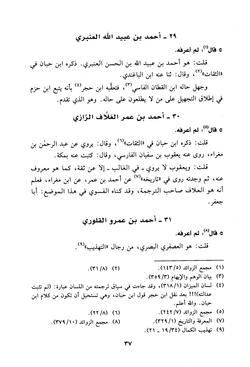 (¬4) لسان الميزان (1/ 318)، وقد جاءت في سياق ترجمته من اللسان عبارة: (لم تثبت عدالته)!!! بعد نقل ابن حجر قول ابن حبان، وهي تستحيل أن تكون من كلام ابن حبان. والله أعلم.