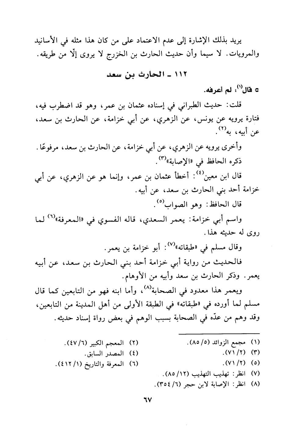 قلت: حديث الطبراني في إسناده عثمان بن عمر، وهو قد اضطرب فيه، فتارة يرويه عن يونس، عن الزهريّ، عن أبي خزامة، عن الحارث بن سعد، عن أبيه، به (¬2).