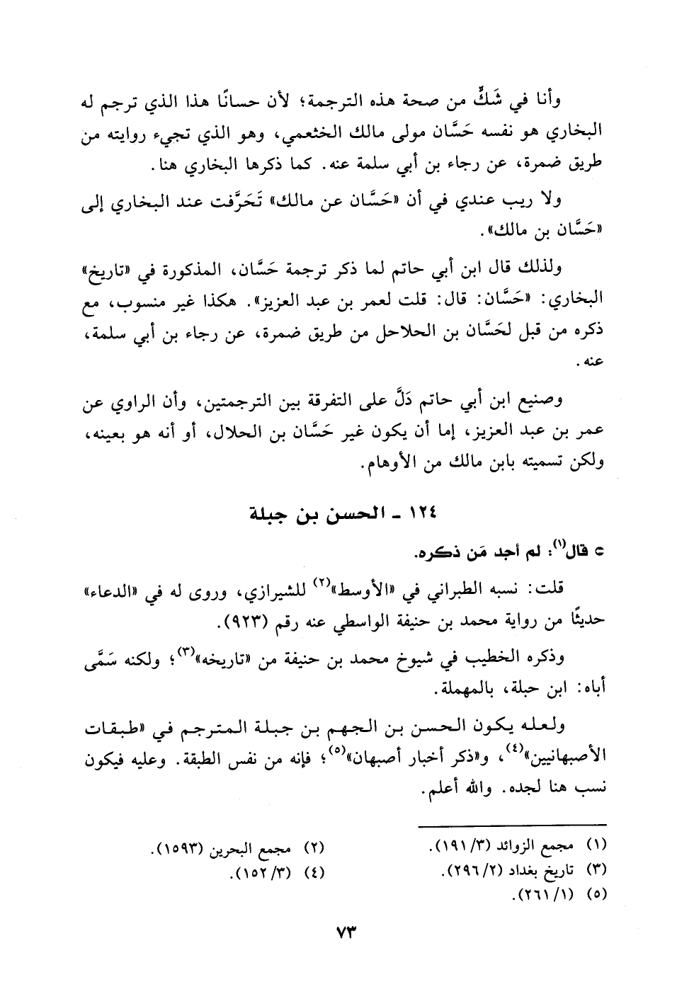 ولذلك قال ابن أبي حاتم لما ذكر ترجمة حَسَّان، المذكورة في "تاريخ" البخاري: "حَسَّان: قال: قلت لعمر بن عبد العزيز". هكذا غير منسوب، مع ذكره من قبل لحسَّان بن الحلاحل من طريق ضمرة، عن رجاء بن أبي سلمة، عنه.