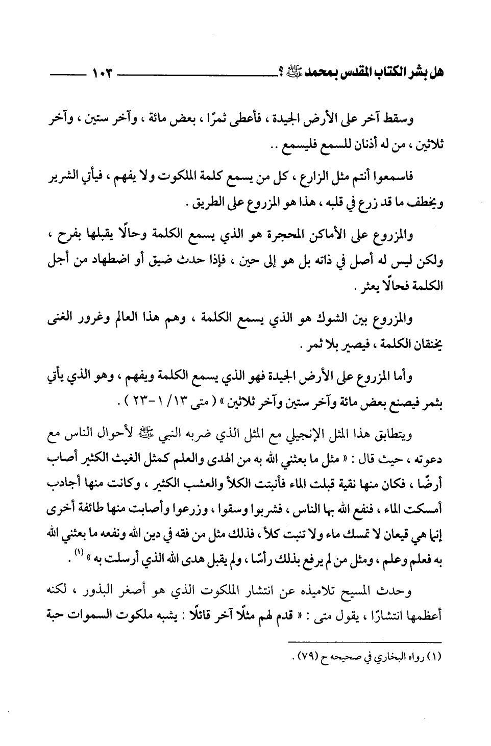 ويتطابق هذا المثل الإنجيلي مع المثل الذي ضربه النبي - صلى الله عليه وسلم - لأحوال الناس مع دعوته، حيث قال: ((مثل ما بعثني الله به من الهدى والعلم كمثل الغيث الكثير أصاب أرضاً، فكان منها نقية قبلت الماء فأنبتت الكلأ والعشب الكثير، وكانت منها أجادب أمسكت الماء، فنفع الله بها الناس، فشربوا وسقوا، وزرعوا وأصابت منها طائفة أخرى إنما هي قيعان لا تمسك ماء ولا تنبت كلأ، فذلك مثل من فقه في دين الله ونفعه ما بعثني الله به فعلم وعلم، ومثل من لم يرفع بذلك رأساً، ولم يقبل هدى الله الذي أرسلت به)). (¬1)