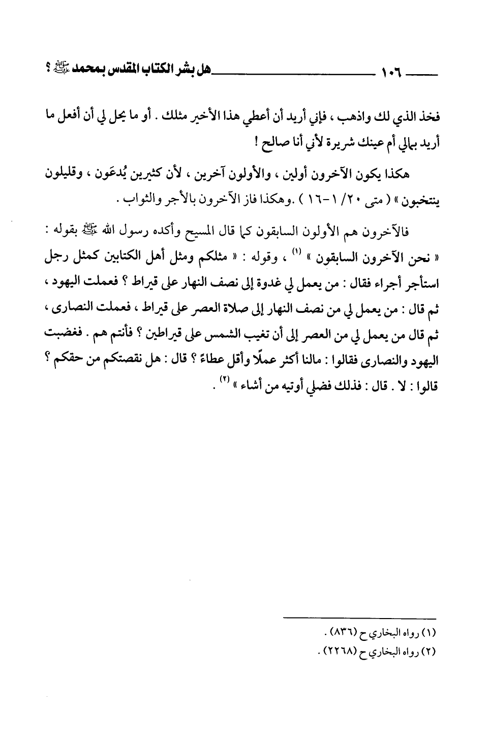 فالآخرون هم الأولون السابقون كما قال المسيح وأكده رسول الله - صلى الله عليه وسلم - بقوله: ((نحن الآخرون السابقون)) (¬1)، وقوله: ((مثلكم ومثل أهل الكتابين كمثل رجل استأجر أجراء فقال: من يعمل لي غدوة إلى نصف النهار على قيراط؟ فعملت اليهود، ثم قال: من يعمل لي من نصف النهار إلى صلاة العصر على قيراط، فعملت النصارى، ثم قال من يعمل لي من العصر إلى أن تغيب الشمس على قيراطين؟ فأنتم هم. فغضبت اليهود والنصارى فقالوا: مالنا أكثر عملاً وأقل عطاءً؟ قال: هل نقصتكم من حقكم؟ قالوا: لا. قال: فذلك فضلي أوتيه من أشاء)). (¬2)