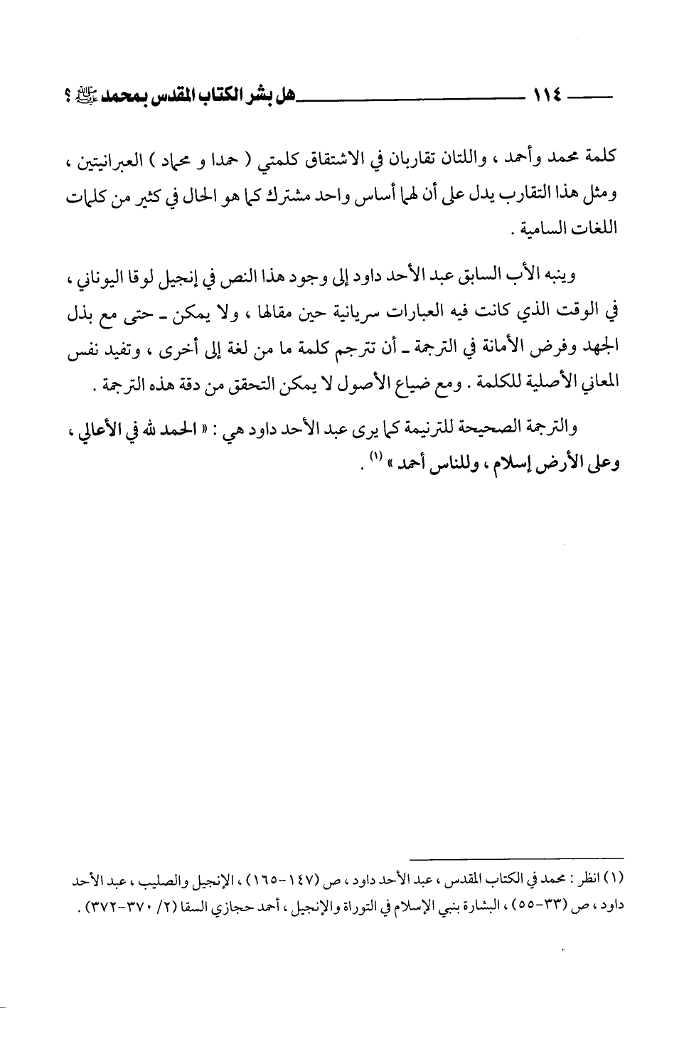 (¬1) انظر: محمد في الكتاب المقدس، عبد الأحد داود، ص (147 - 165)، الإنجيل والصليب، عبد الأحد داود، ص (33 - 55)، البشارة بنبي الإسلام في التوراة والإنجيل، أحمد حجازي السقا (2/ 370 - 372).