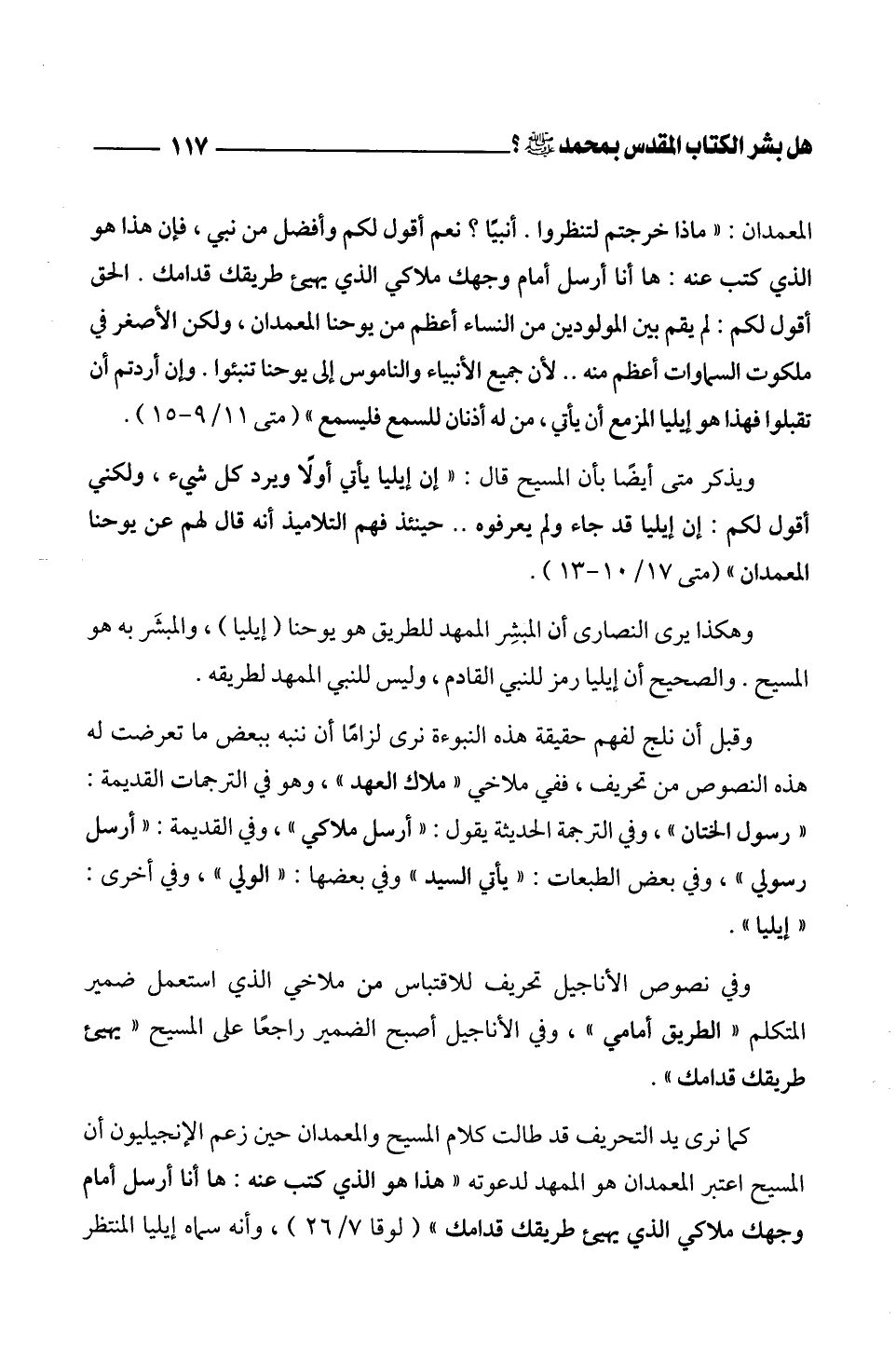 وهكذا يرى النصارى أن المبشِر الممهد للطريق هو يوحنا (إيليا)، والمبشَر به هو المسيح. والصحيح أن إيليا رمز للنبي القادم، وليس للنبي الممهد لطريقه.