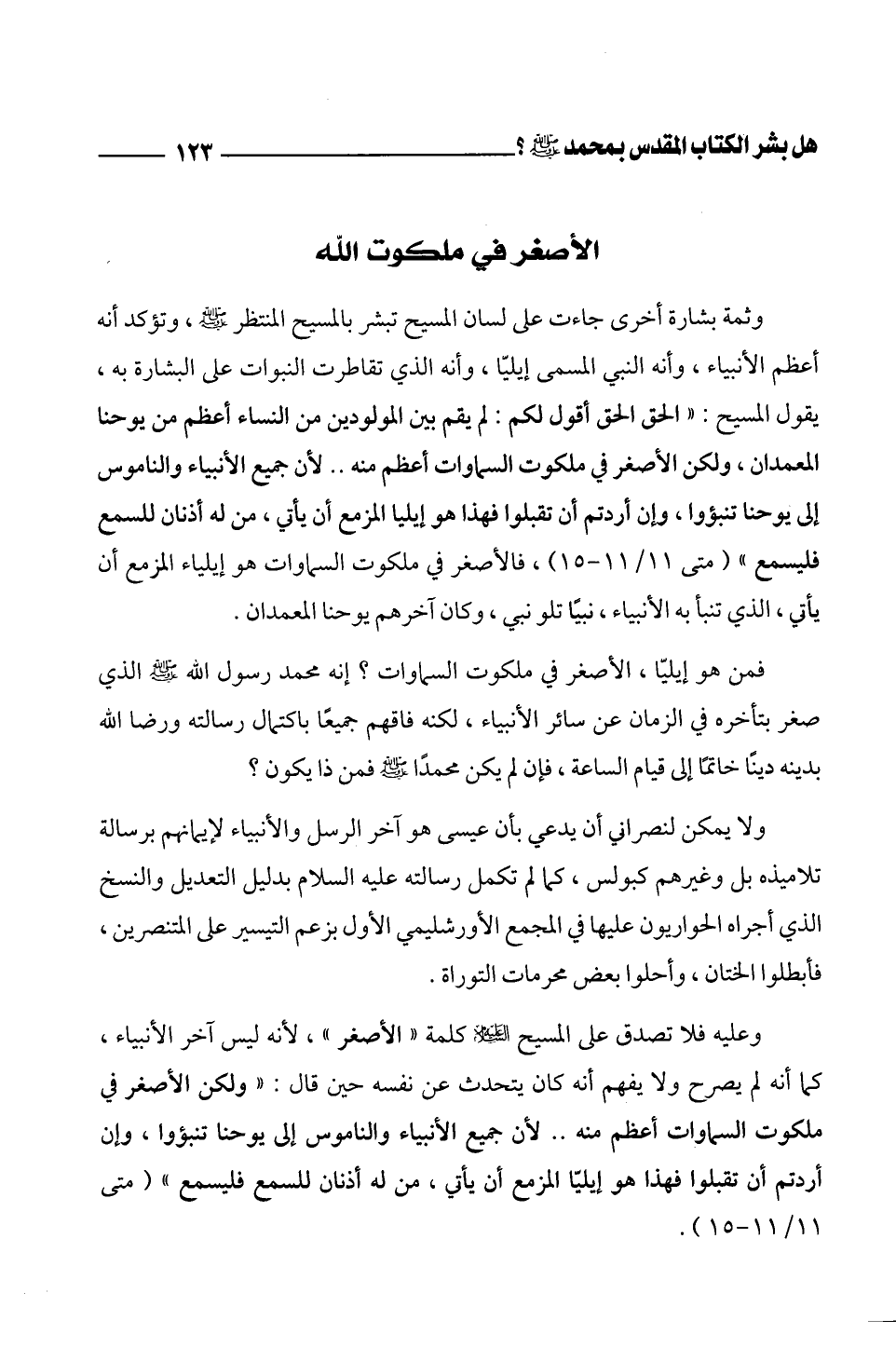 وعليه فلا تصدق على المسيح - عليه السلام - كلمة " الأصغر "، لأنه ليس آخر الأنبياء، كما أنه لم يصرح ولا يفهم أنه كان يتحدث عن نفسه حين قال: " ولكن الأصغر في ملكوت السماوات أعظم منه .. لأن جميع الأنبياء والناموس إلى يوحنا تنبؤوا، وإن أردتم أن تقبلوا فهذا هو إيليّا المزمع أن يأتي، من له أذنان للسمع فليسمع " (متى 11/ 11 - 15).