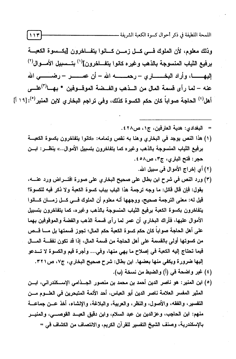 وذلك معلوم، لأن الملوك في كل زمان كانوا يتفاخرون [بكسوة الكعبة برفيع الثياب المنسوجة بالذهب وغيره كانوا يتفاخرون] بتسبيل الأموال إليها، وأراد البخاري -رحمه الله- أن عمر -رضي الله عنه- لما رأى قسمة المال من الذهب والفضة الموقوفين بها على أهل الحاجة صواباً كان حكم الكسوة كذلك، وفي تراجم البخاري لابن المنير:
