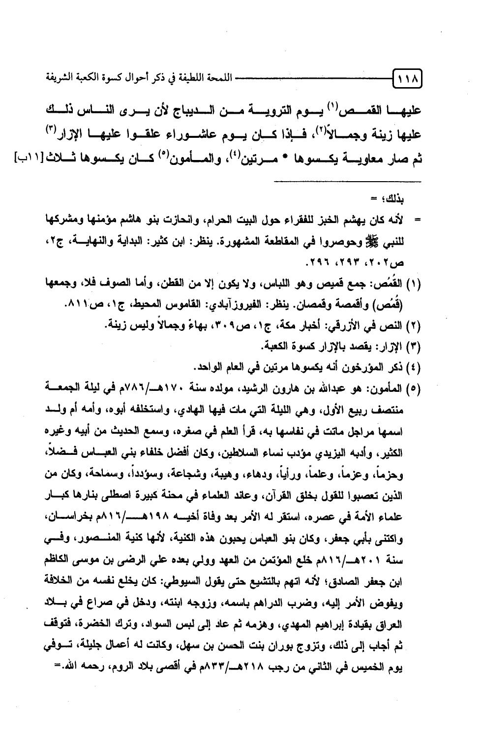 عليها القمص يوم التروية من الديباج لأن يرى الناس ذلك عليها زينة وجمالاً، فإذا كان يوم عاشوراء علقوا عليها الإزار ثم صار معاوية يكسوها مرتين، والمأمون كان يكسوها ثلاث